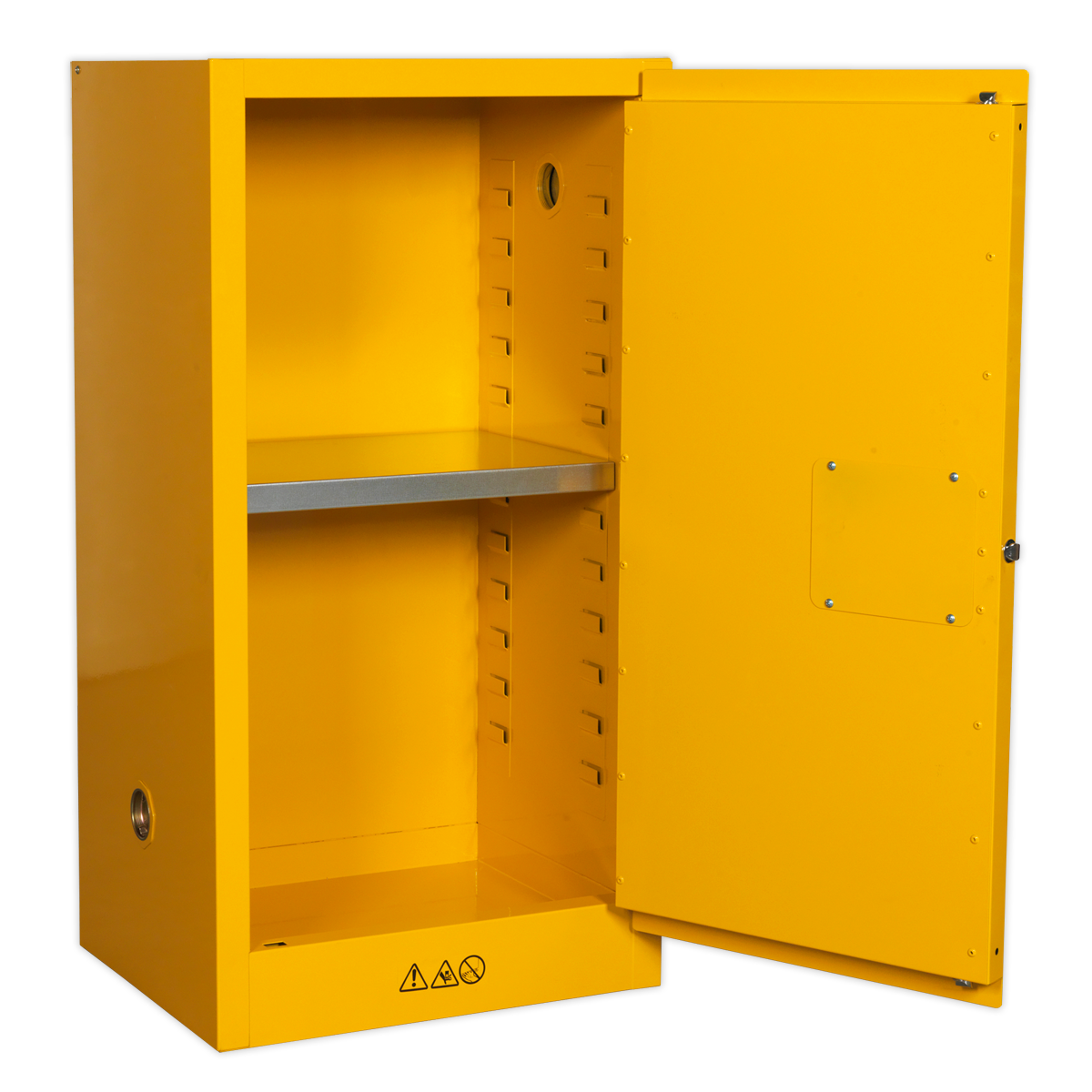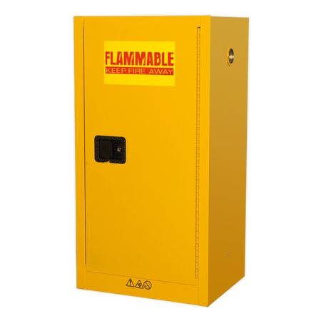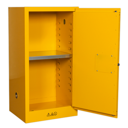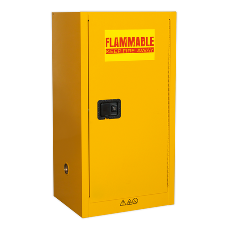 Sturdy metal construction with a yellow powder coated finish. Single door, fitted with a 3-point key lock with recessed handle, supplied with two keys. Features an adjustable lipped shelf and a liquid-tight base to retain spills. Also benefits from two 2"BSP ventilation ports with caps that are equipped with a magnetic backing for convenient storage near the ports Four adjustable feet allow for the cabinet to be set level on uneven ground. For the safe storage of flammables, pesticides, paint and ink. Supplied with a pack of appropriate warning labels.