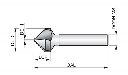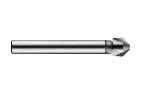 Countersink with 3-flutes, 90° chamfering angle, maximum diameter 12.40mm with an overall length of 56mm and a head length of 8.5mm and 8mm straight shank, according to DIN 335 C standard to produce a conical seat for ISO Metric countersunk-head screws with a minium hole diameter of 2.80mm, HSS with standard bright finish for machining free machining, plain carbon and alloy steel, copper or copper alloys