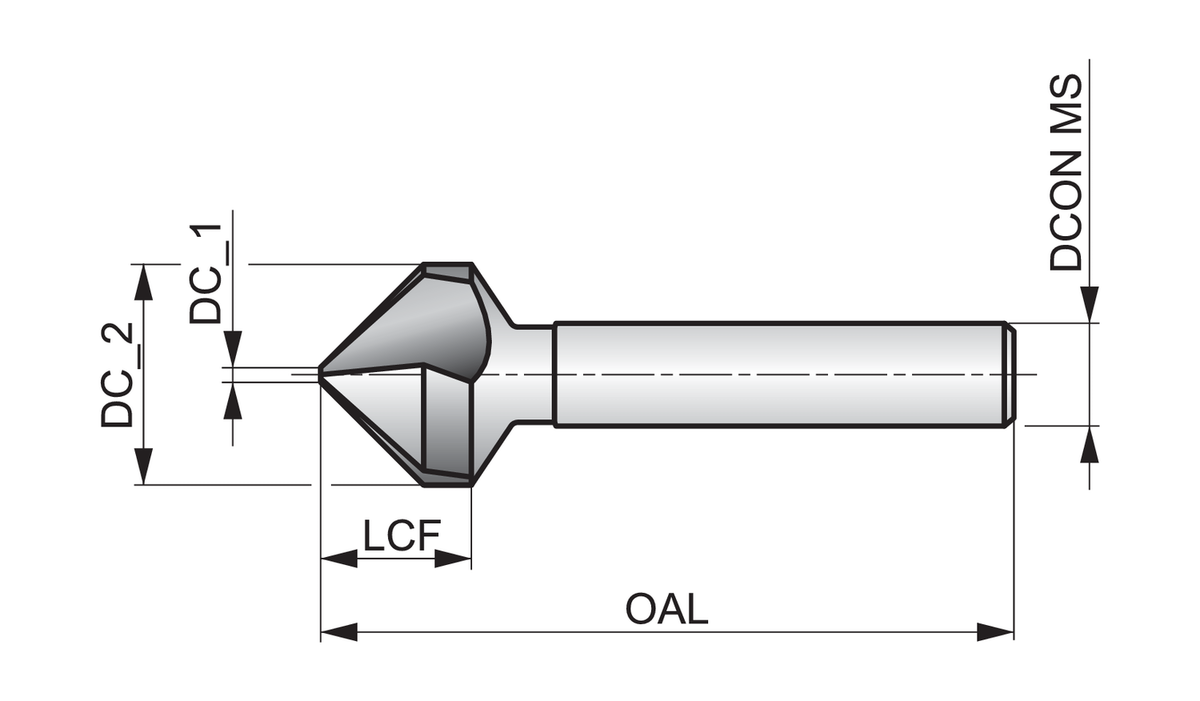 Countersink with 3-flutes, 90° chamfering angle, maximum diameter 20.50mm with an overall length of 63mm and a head length of 13mm and 10mm straight shank, according to DIN 335 C standard to produce a conical seat for ISO Metric countersunk-head screws with a minium hole diameter of 3.50mm, HSS with standard bright finish for machining free machining, plain carbon and alloy steel, copper or copper alloys