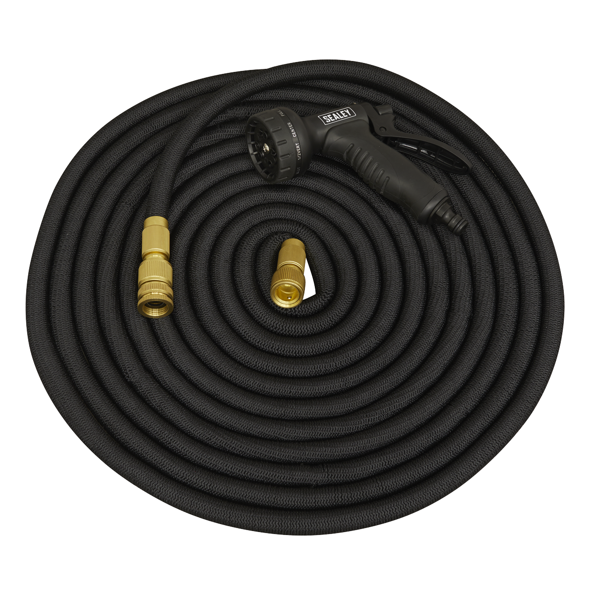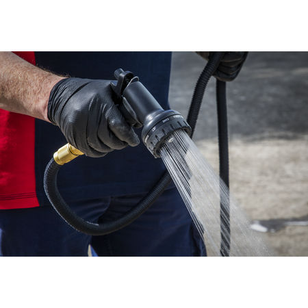 Expandable hose can reach distances of up to 30m, yet can still be stored away with ease. Latex material increases the strength and durability of the garden hose. Weave design prevents tears when under tension. Supplied with brass fittings that can stop the build-up of rust, and stop the hose from cracking, leaking or corroding. Spray nozzle features comfortable trigger and handle as well as ten different settings to suit a variety of tasks. Suitable for watering, gardening, pool cleaning, vehicle cleaning and much more.