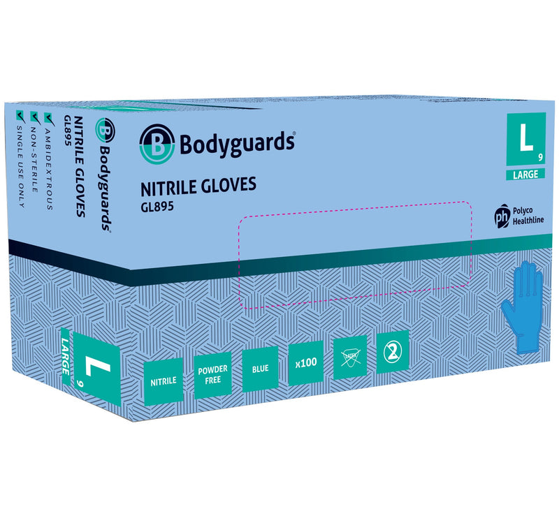 The GL890 Bodyguards Blue Nitrile Gloves are mid-weight, non-sterile medical gloves designed for reliable performance and user comfort. Featuring optimised textured finger grip, these gloves ensure precise and confident handling of instruments and tools, enhancing both control and tactile sensitivity. Made from a soft elastic material, they provide superior flexibility and comfort, while being latex free to suit individuals with latex allergies.