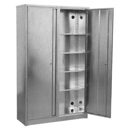 Floor standing galvanized steel cabinet with lockable double doors. Fitted with four adjustable shelves and base storage. Supplied with four keys. Ideal for factory, workshop or home use. Features two rear wiring grommets allowing power tool batteries and other devices to be charged whilst in storage. Floor cabinet is supplied flat-packed and will need some assembly.