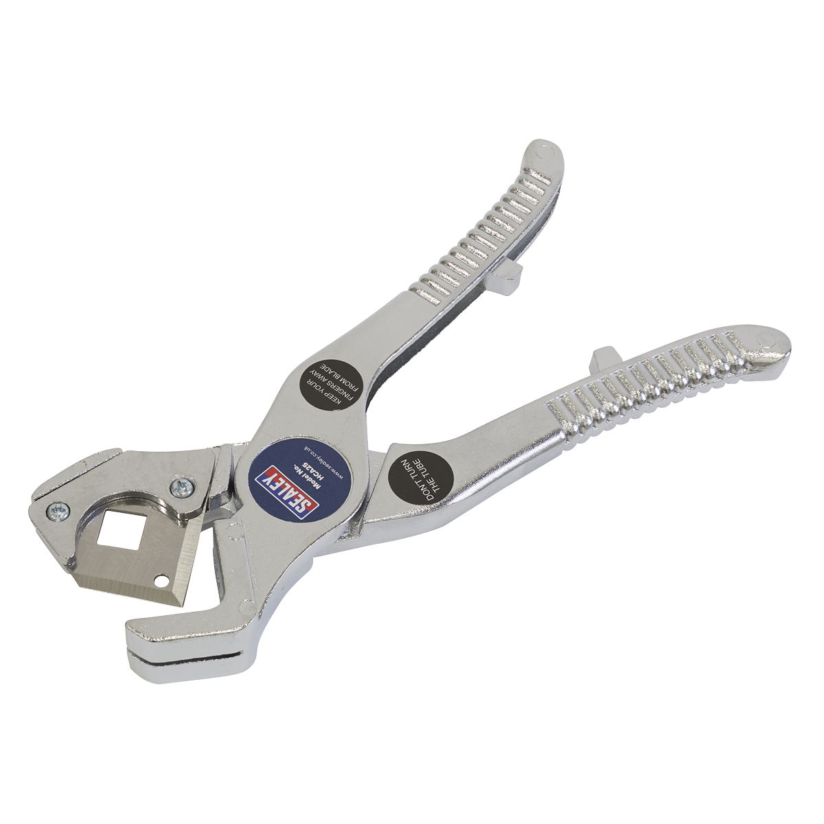 Die-cast zinc alloy body with simple plier action. Suitable for hoses from Ø3-25mm. Simple reversible steel blade hardened and tempered to 50-55 HRC. Supplied in pouch.