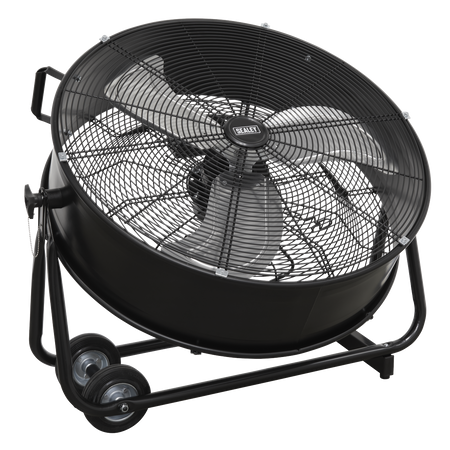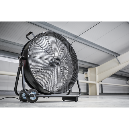 High velocity industrial 2-speed drum fan suitable for movement of huge volumes of air. Robust unit with heavy-duty gauge steel casing, guard and frame. Handle, wheels and tilt function cradle stand allow control of airflow where it is needed. Carefully balanced and fully guarded blades provide safe operation. Fitted with 3-pin plug. Suitable for use in industrial, commercial, agricultural, automotive workshop and showroom applications.