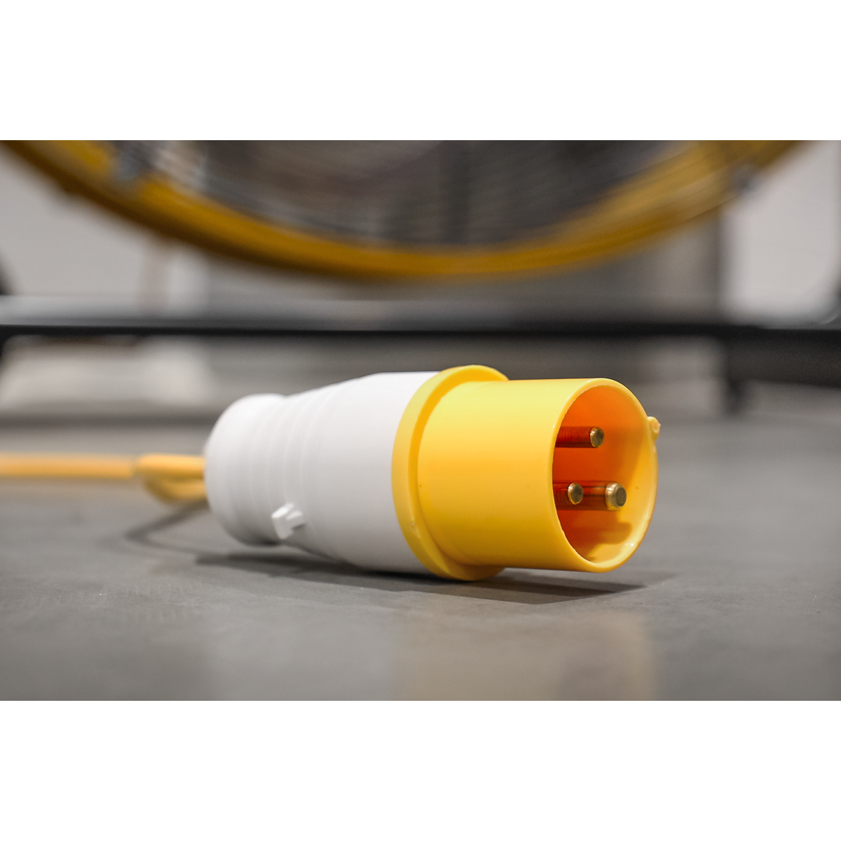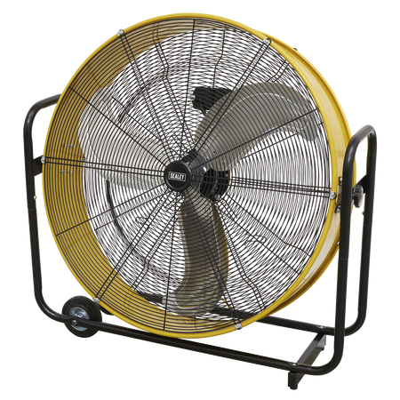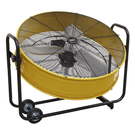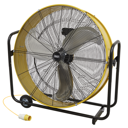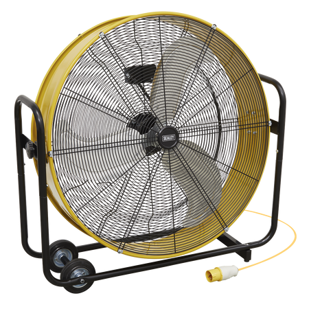 High velocity industrial drum fan suitable for movement of huge volumes of air. Robust unit with heavy-duty gauge steel casing, guard and frame. Handle, wheels and tilt function cradle stand, allow the control of airflow where it is needed. Carefully balanced and fully guarded blades provide safe operation. Fitted with 16A 110V plug. Suitable for industrial, commercial, agricultural, automotive and on site applications.