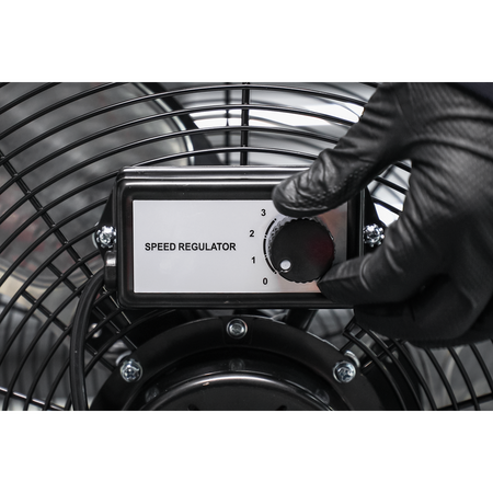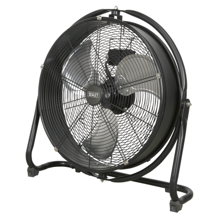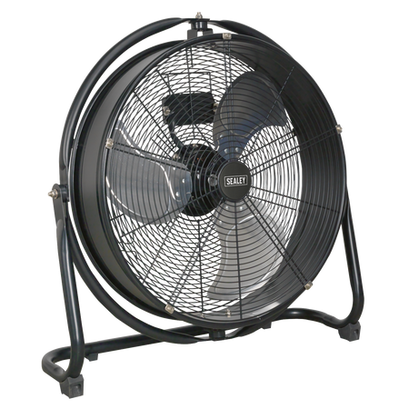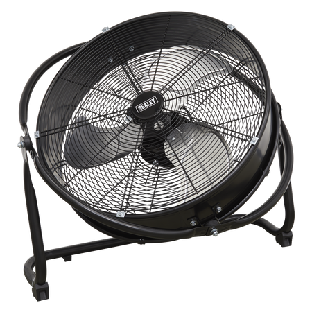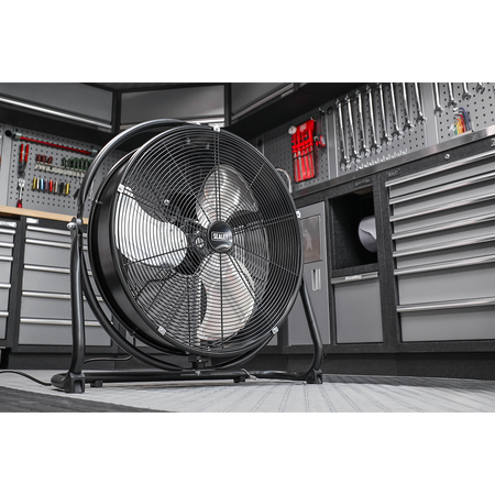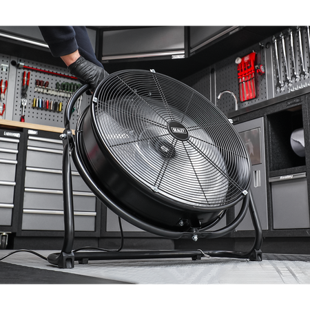 High velocity industrial 3-speed drum fan suitable for movement of huge volumes of air. Robust unit with heavy-duty gauge steel casing, guard and frame. Featuring a 360° tilt function allowing for the direction of airflow to be positioned anywhere on a 360° axis. Carefully balanced and fully guarded blades provide safe operation. Fitted with 3-pin plug. Suitable for industrial, commercial, agricultural, automotive workshop and showroom applications.