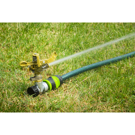 Sprinkler can cover a maximum diameter of 20m. Pulsating sprinkler offers semi-circle to full circle coverage with 360° range. Also features adjustment for jet or fan spray. Mounted on a spike manufactured from high quality zinc to provide stability during use. Fitted with standard push-fit hose connection compatible with all universal female hose connectors.