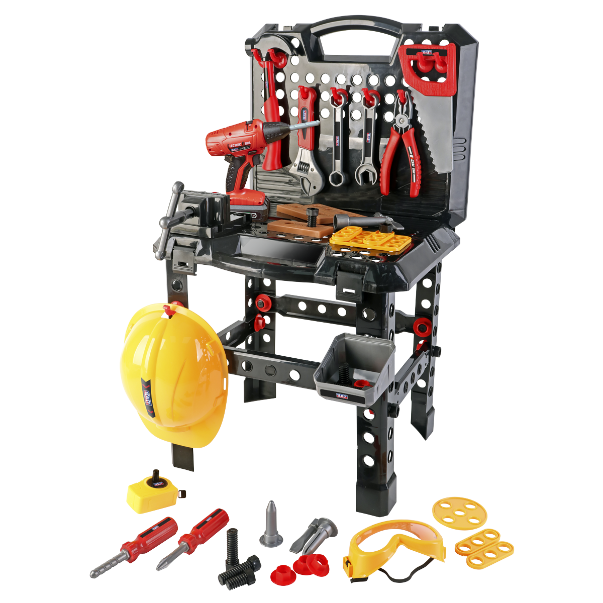 - Contents Workbench, Screwdriver (x2), Adjustable Wrench, Pliers, Hammer, Saw, Electric Drill with Assorted Drill Bits, Spanner (x2), Nuts (x20), Bolts (x20), Pre-drilled Blocks (x3), Pre-Drilled Shapes (x6), Hooks (x10), Hat, Goggles, Double-Sided Tape Measure, Tray, T-Wrench, Plugs (x2), Vice.