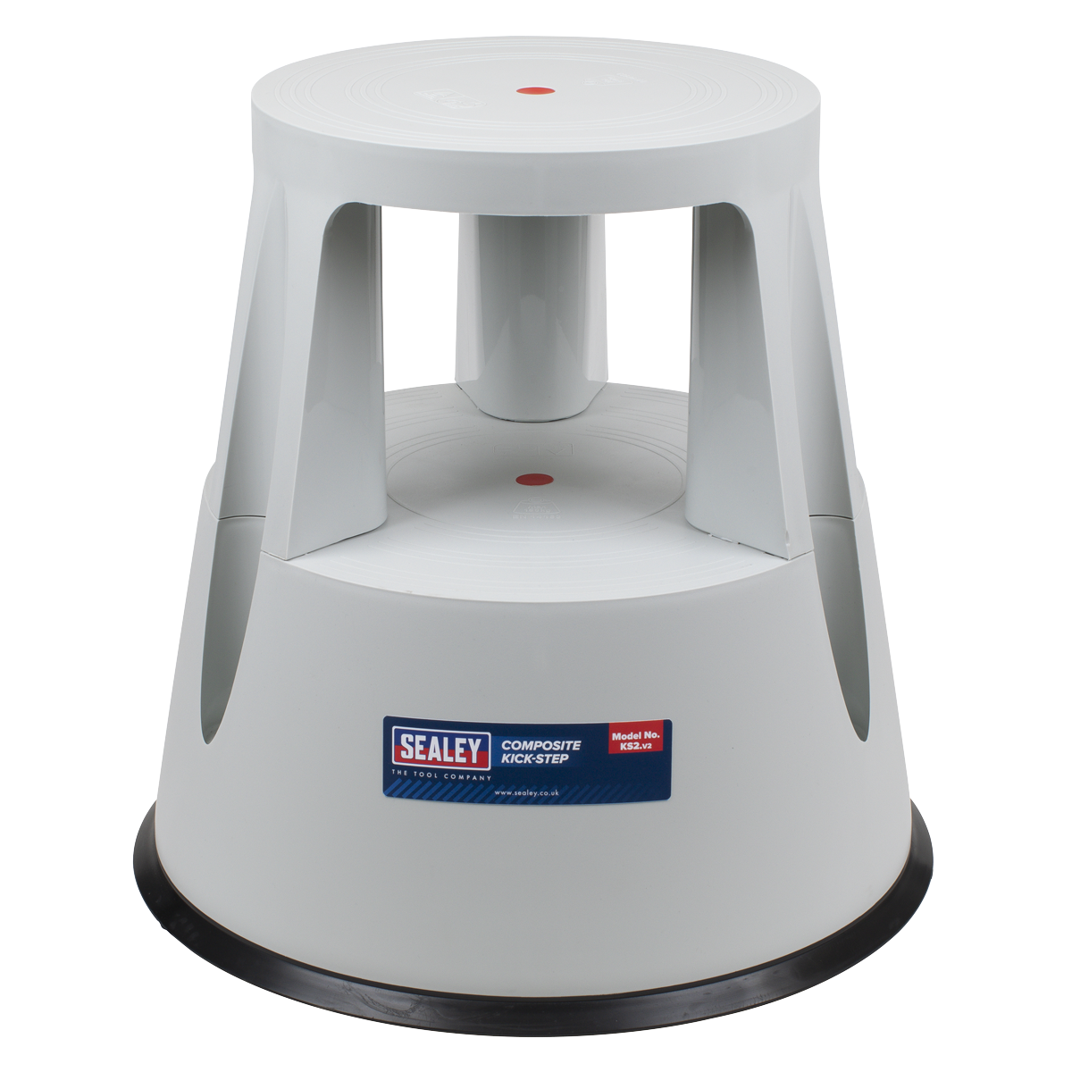 Robust composite construction with non-slip surface. Three spring loaded wheels allow step to glide over floor, yet sit down firmly on rubber stops when load is applied.