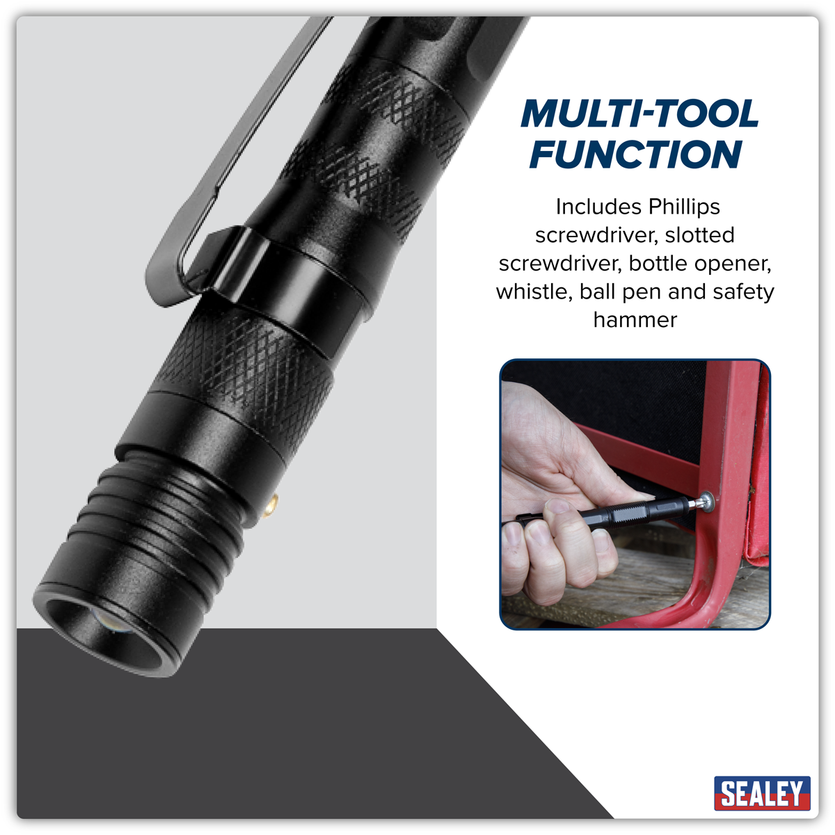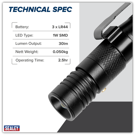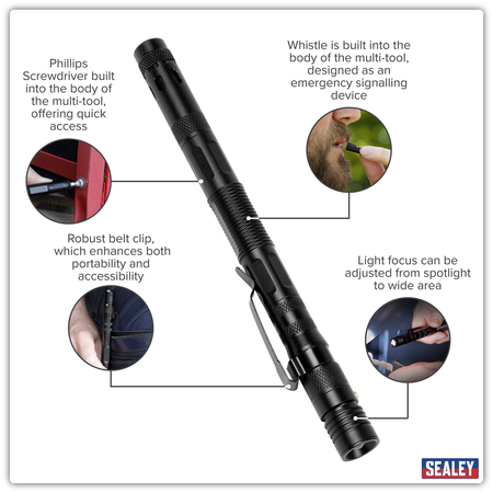 Produces bright white light from single 1W SMD LED. Sliding action light focus can be adjusted from spotlight to wide area. Strobe light function for emergencies. Multi-tool function includes Phillips screwdriver, slotted screwdriver, bottle opener, whistle, ball pen and safety hammer. Ideal for storing in glove box. Includes 3 x LR44 batteries (supplied).