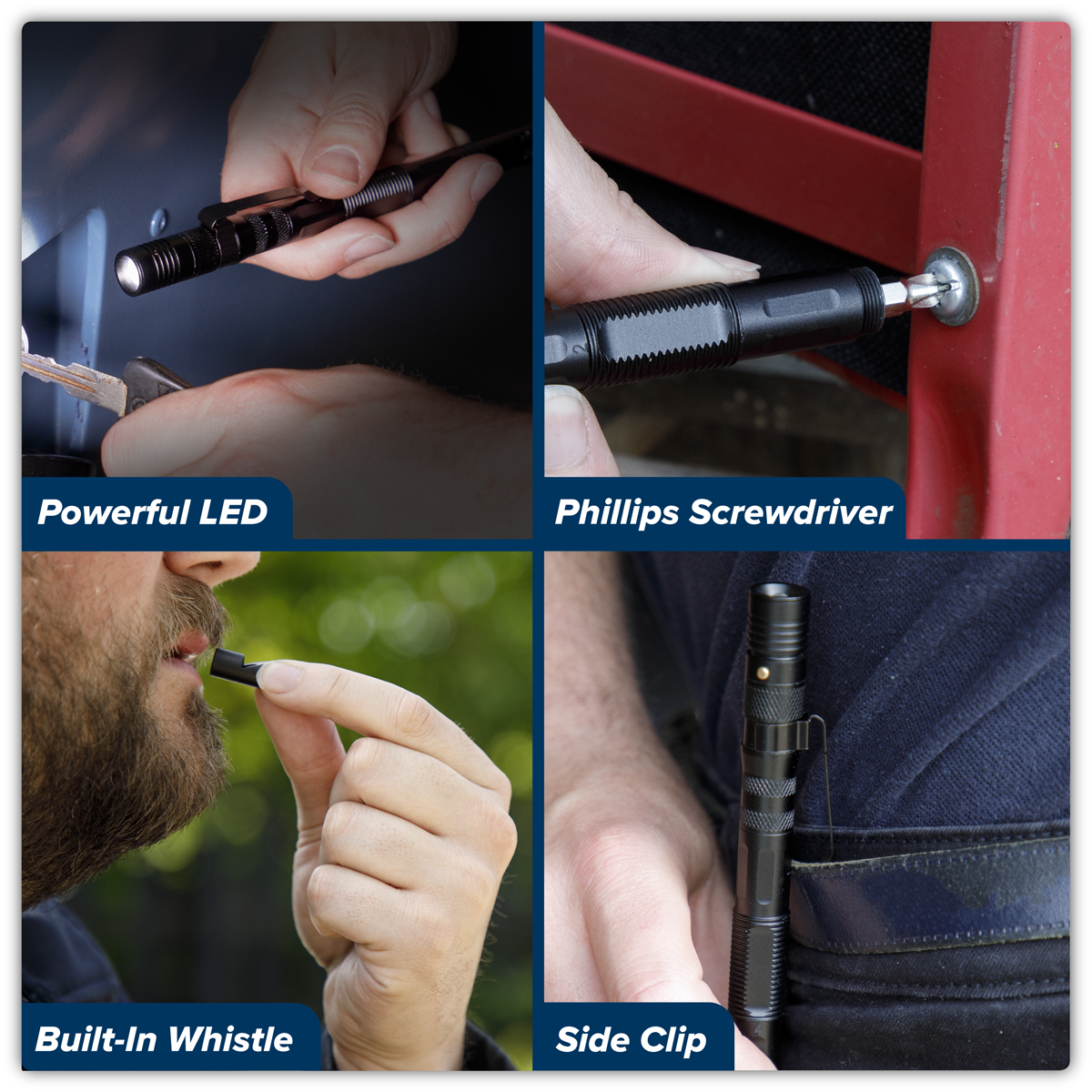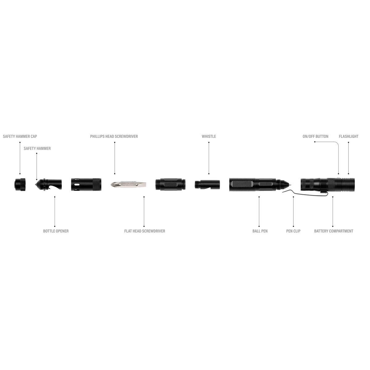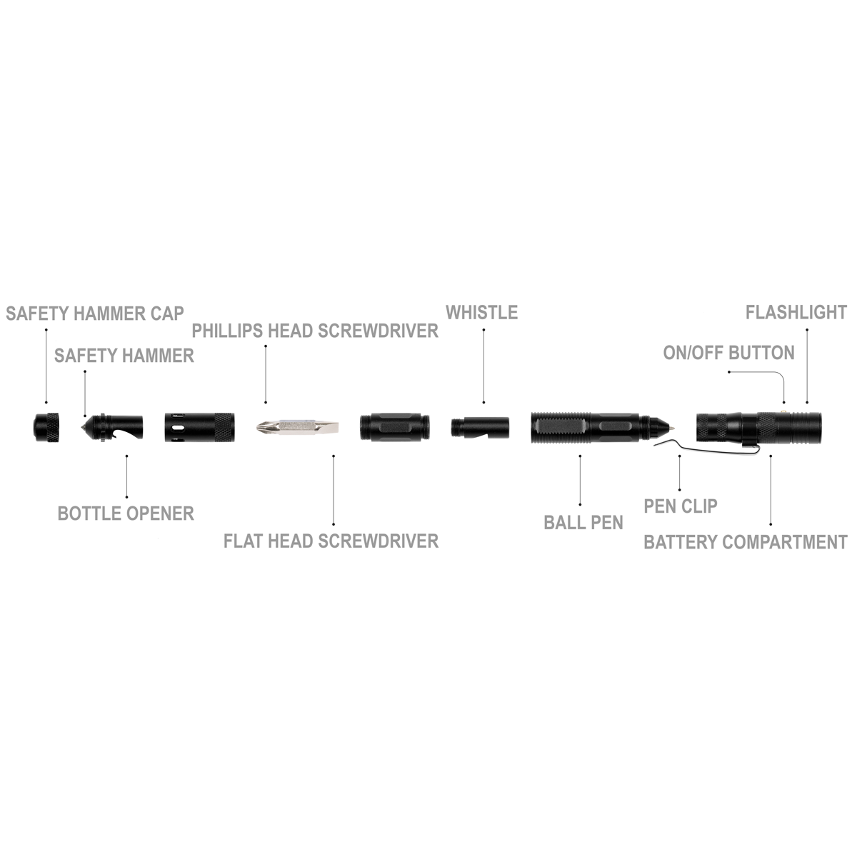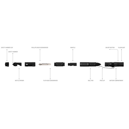 • Multi-tool function includes Phillips screwdriver, slotted screwdriver, bottle opener, whistle, ball pen and safety hammer.