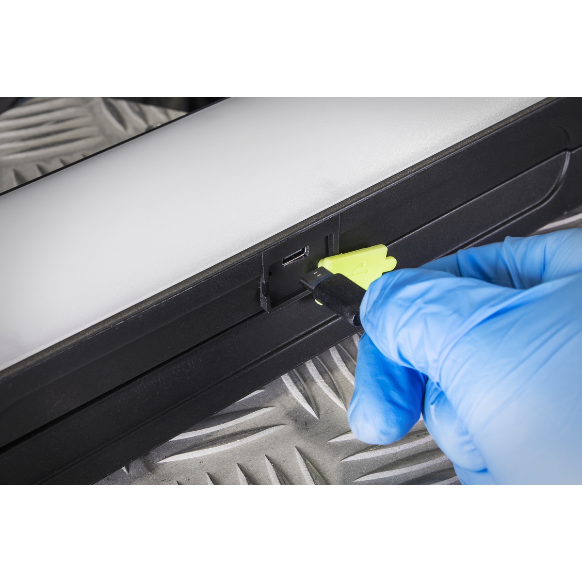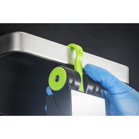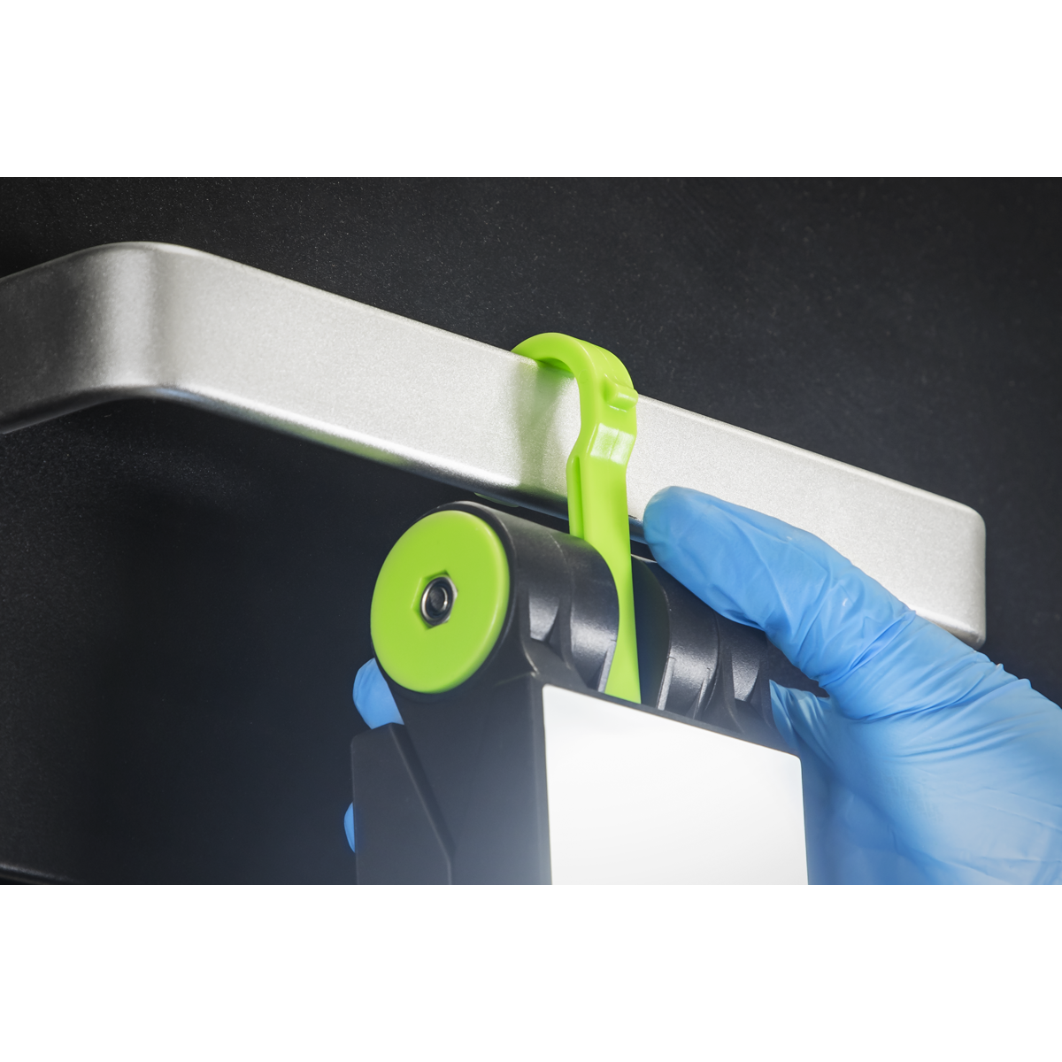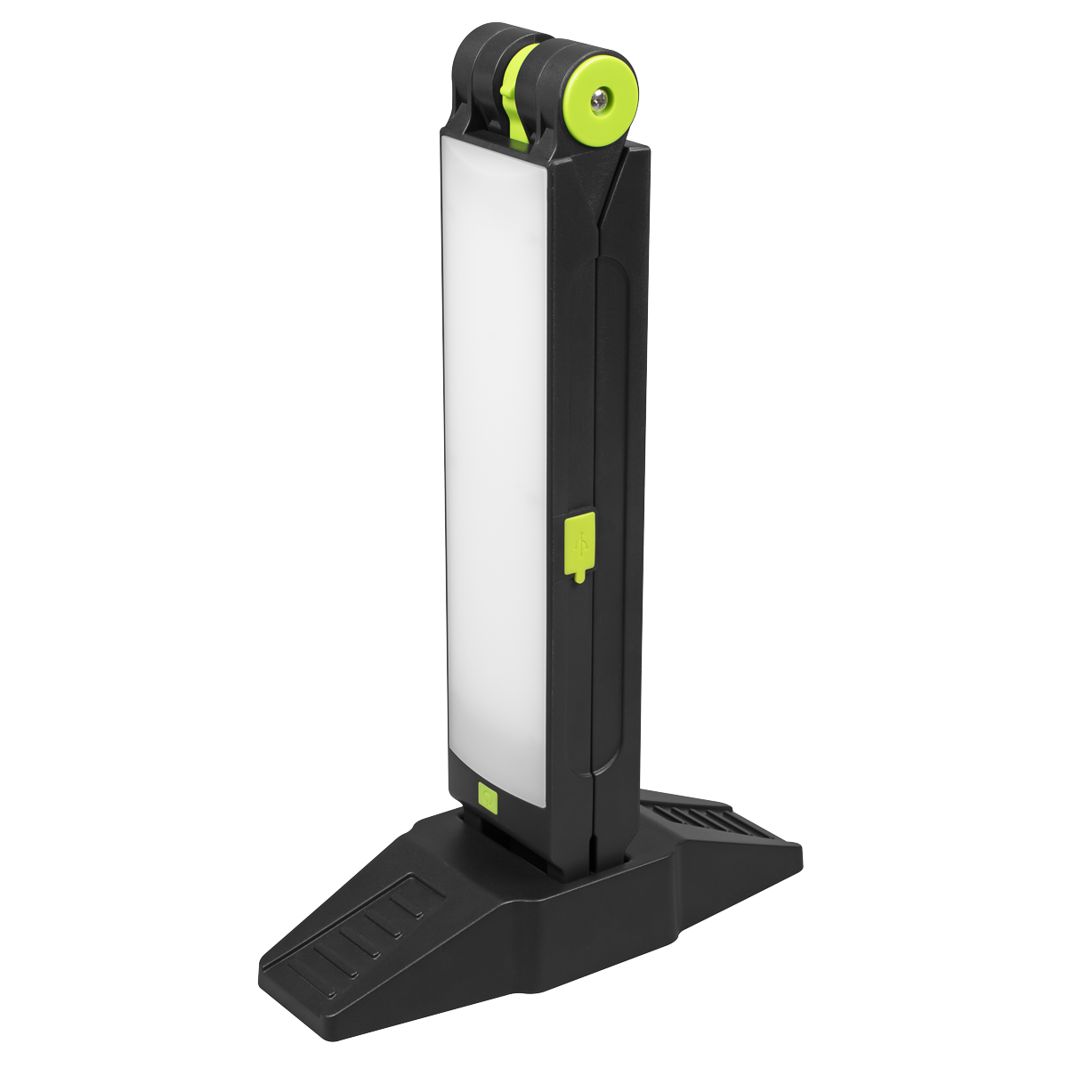 3-in-1 Design makes this light perfect for almost any situation and workplace. Folding floodlight can either be placed into the stand folded to illuminate both sides of a room or extended to create one long floodlight. Floodlight supplied with a strong base to keep the light upright and in position. Fold out magnets are situated at either end to be used as an under-bonnet light. The light also features hooks at either end and one centrally so you can hang it almost anywhere. Very bright 1000 lumens light with three different light settings. Rechargeable 3.7V Li-ion 4.4Ah battery supplied with USB charging cable.