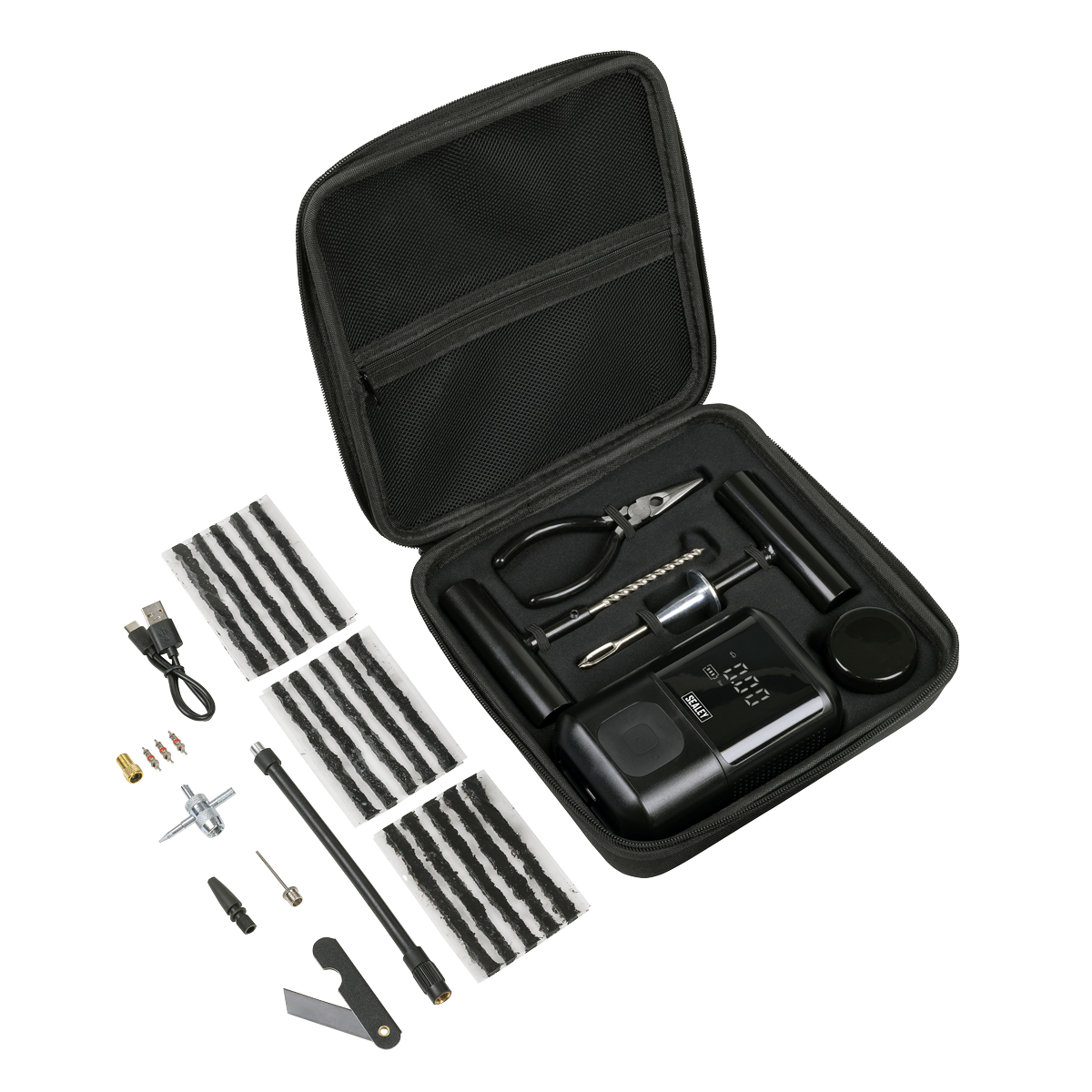 Ideal for repairing punctures on tubeless tyres on cars, commercial, agricultural and off-road vehicles in situ without removing the tyres from the wheel. Rechargeable digital tyre inflator with an output of 8L/min. With five preset modes, car, bike, motorcycle, sports ball and manual. The unit will stop automatically once the pressure is reached. Built-in 0.5W SMD LED light with an output of 50 lumens for ease of use at night with SOS signal and strobe mode. Temporary use only, not to be used as a permanent repair for road vehicles. Supplied in hard shell storage case.