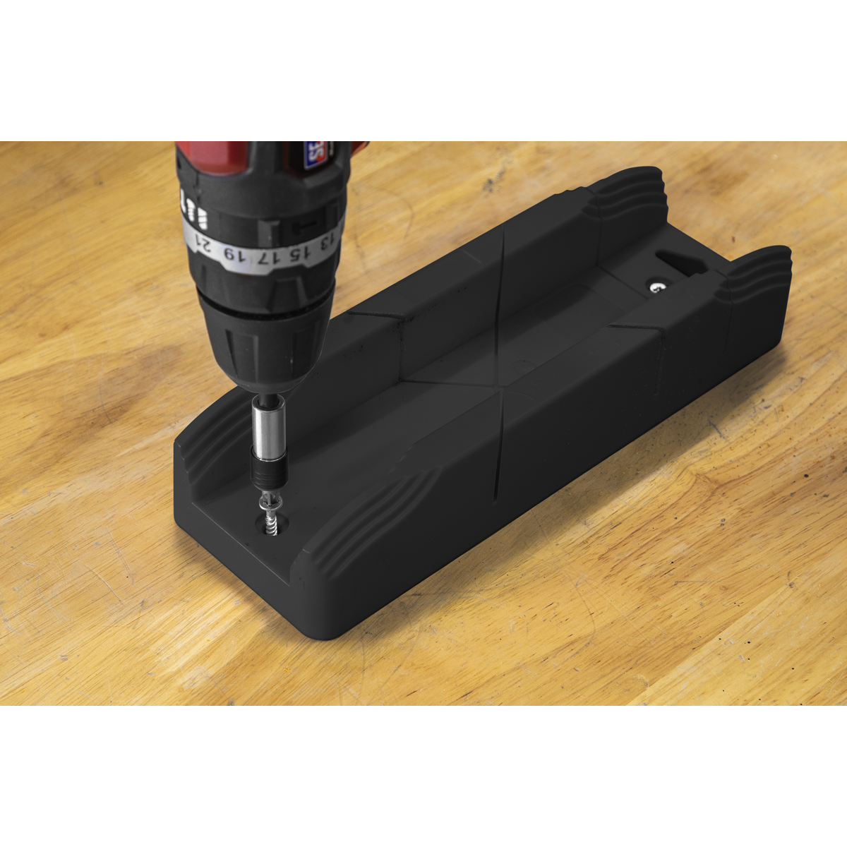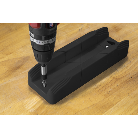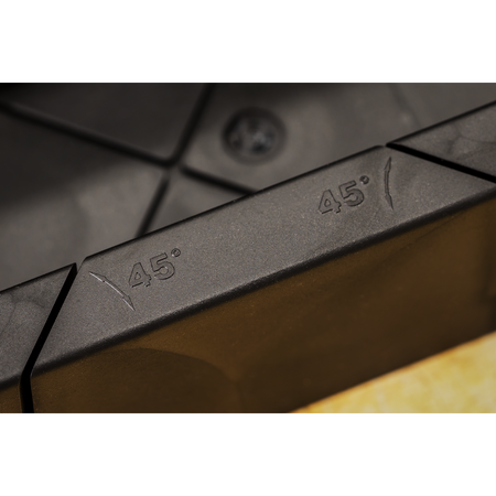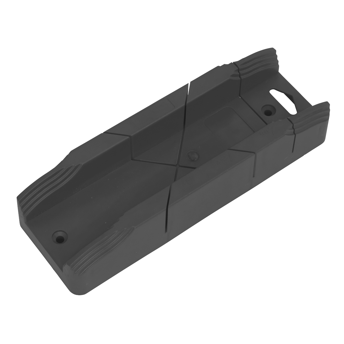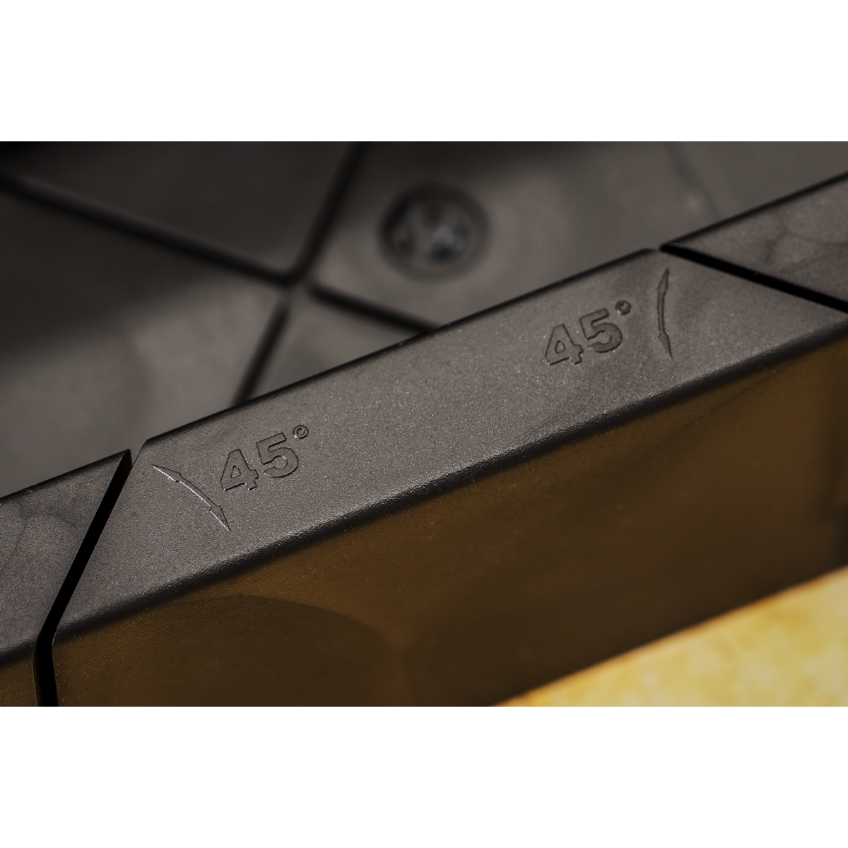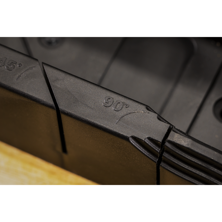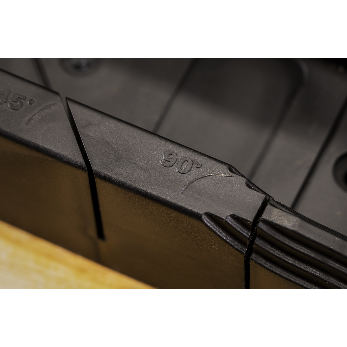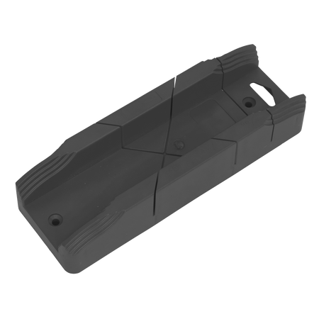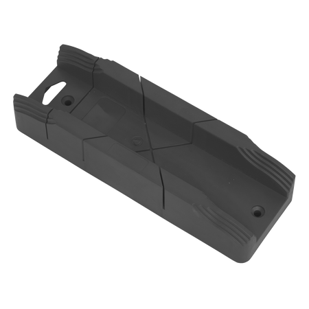 General-purpose mini mitre box, made from high strength plastic. Performs 45° and 90° mitre cuts. Box can be fixed to the workbench via two fixing holes.
