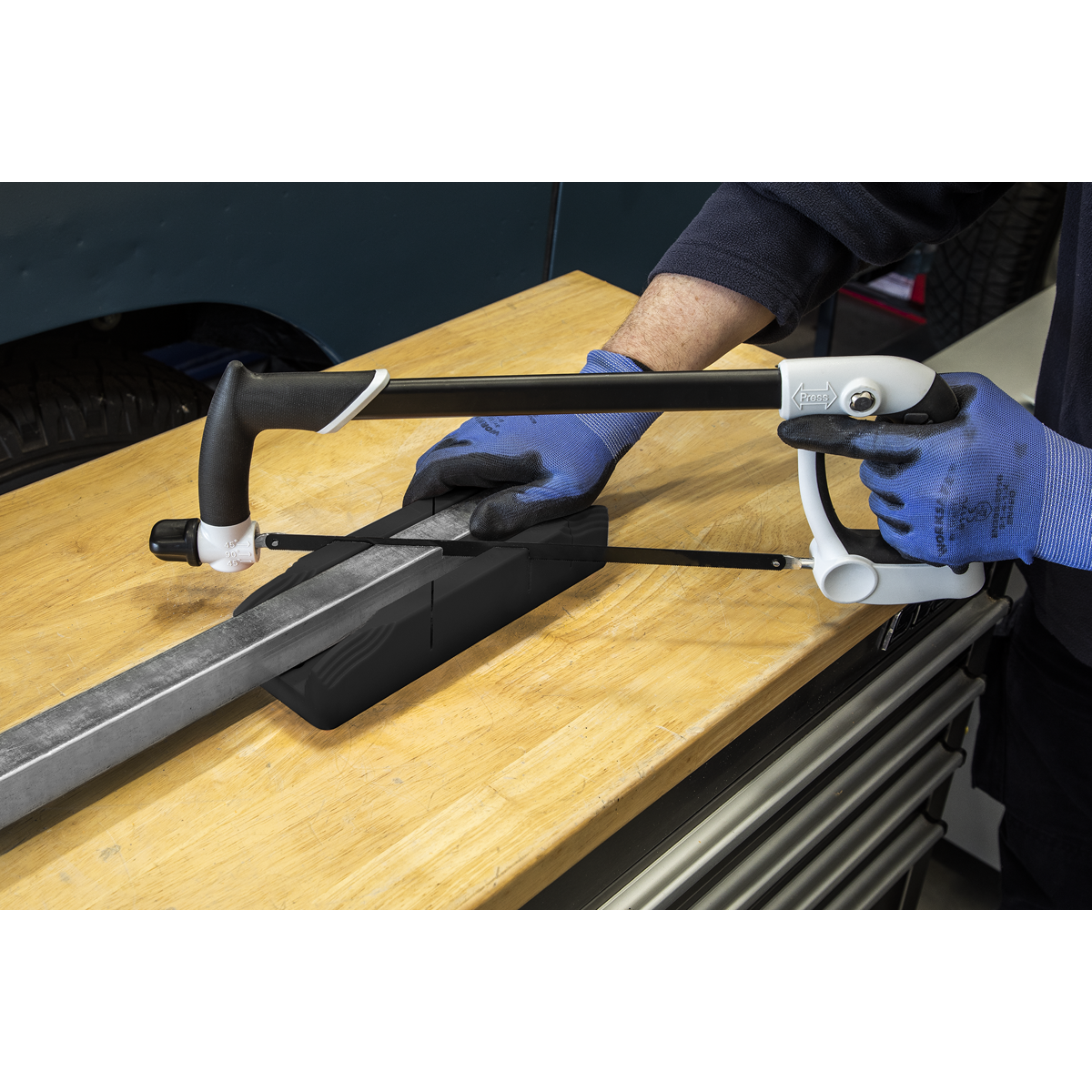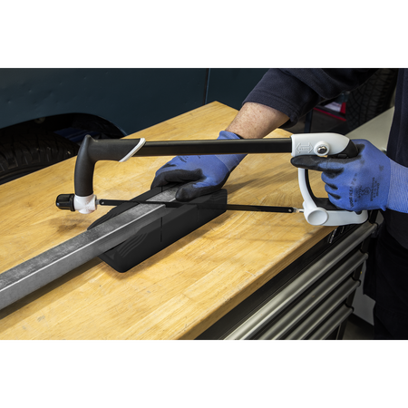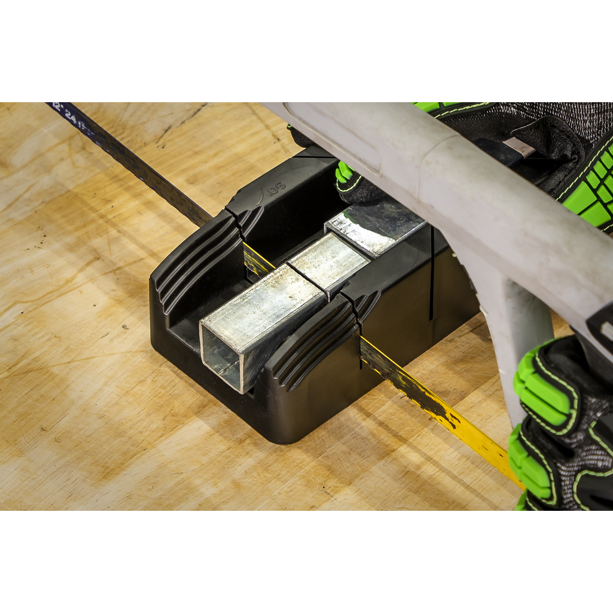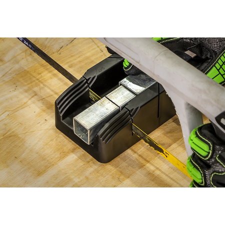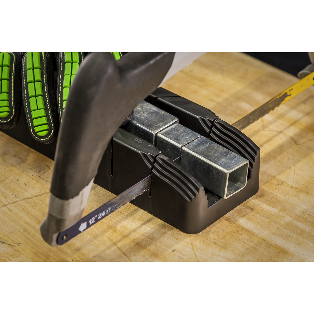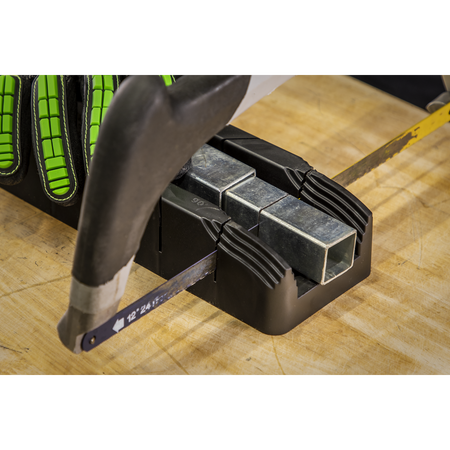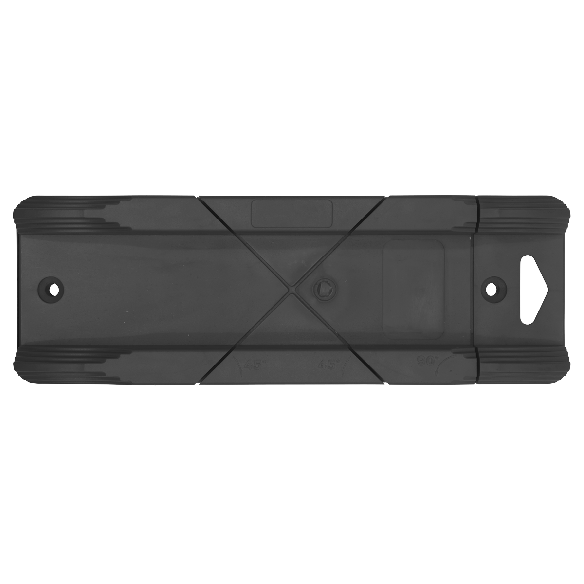 General-purpose mini mitre box, made from high strength plastic. Performs 45° and 90° mitre cuts. Box can be fixed to the workbench via two fixing holes.