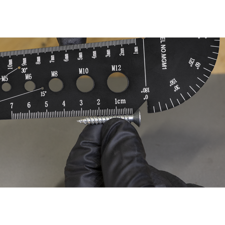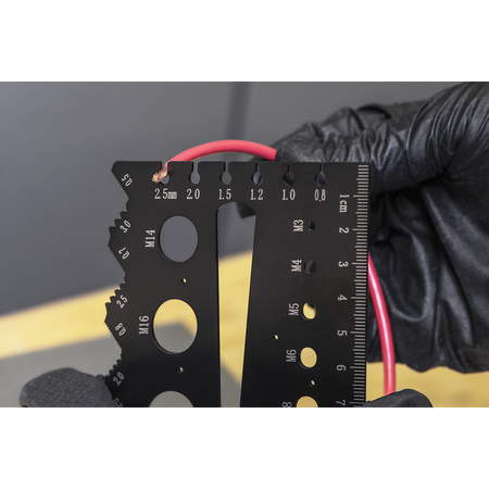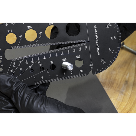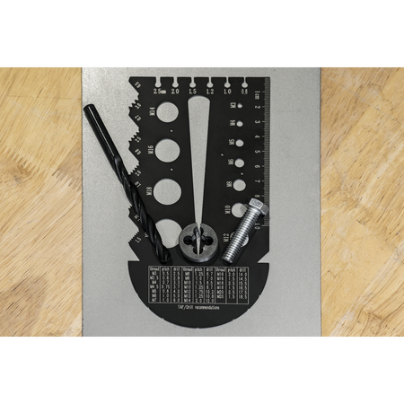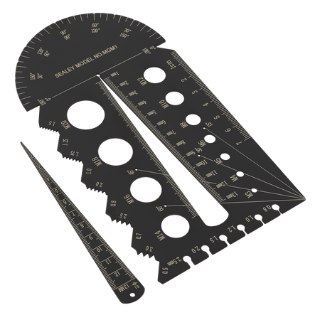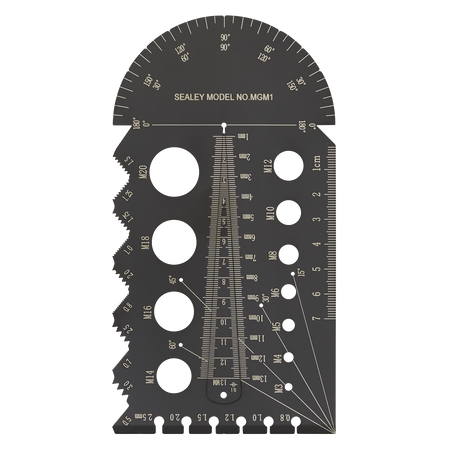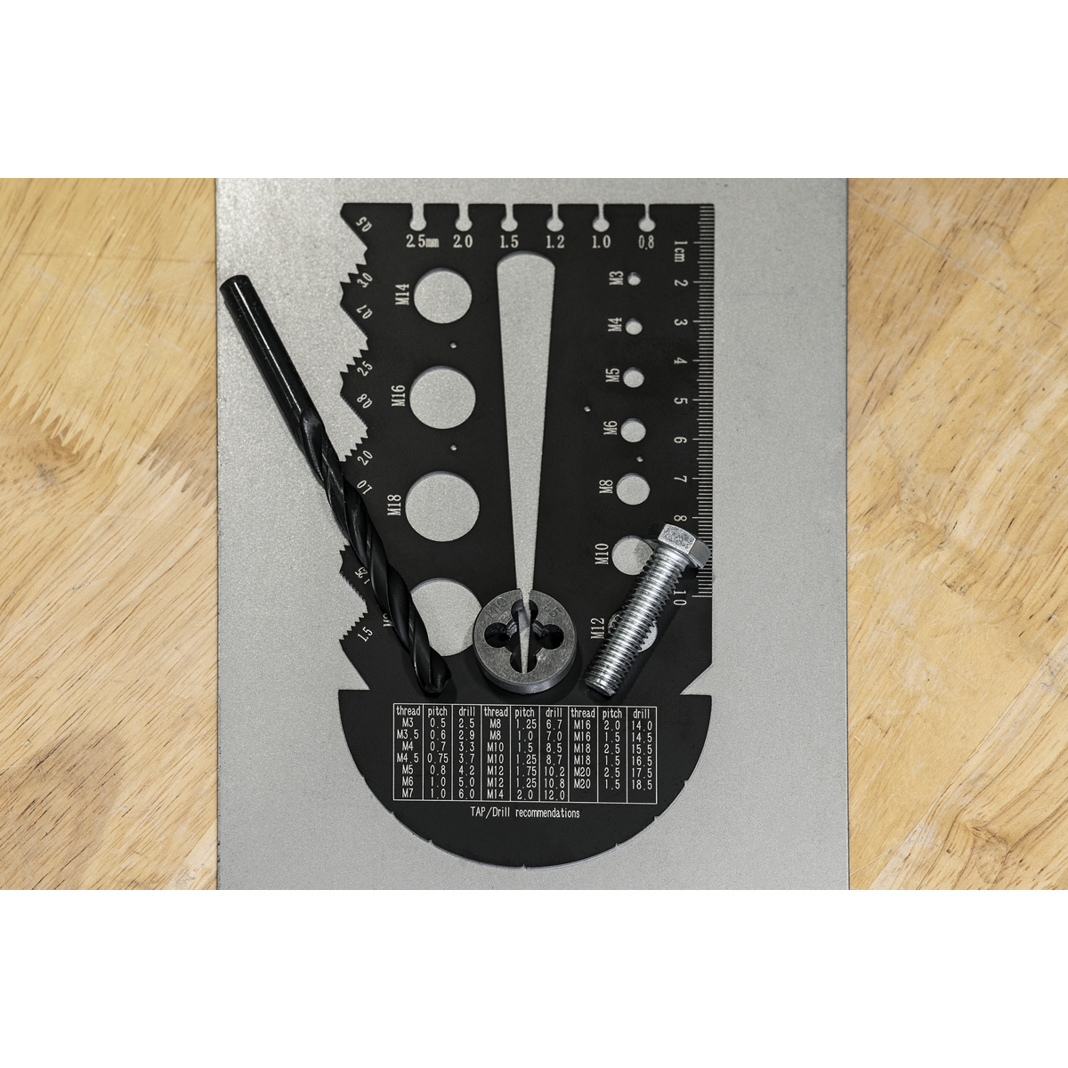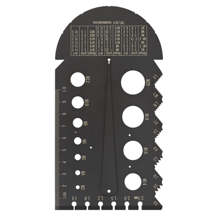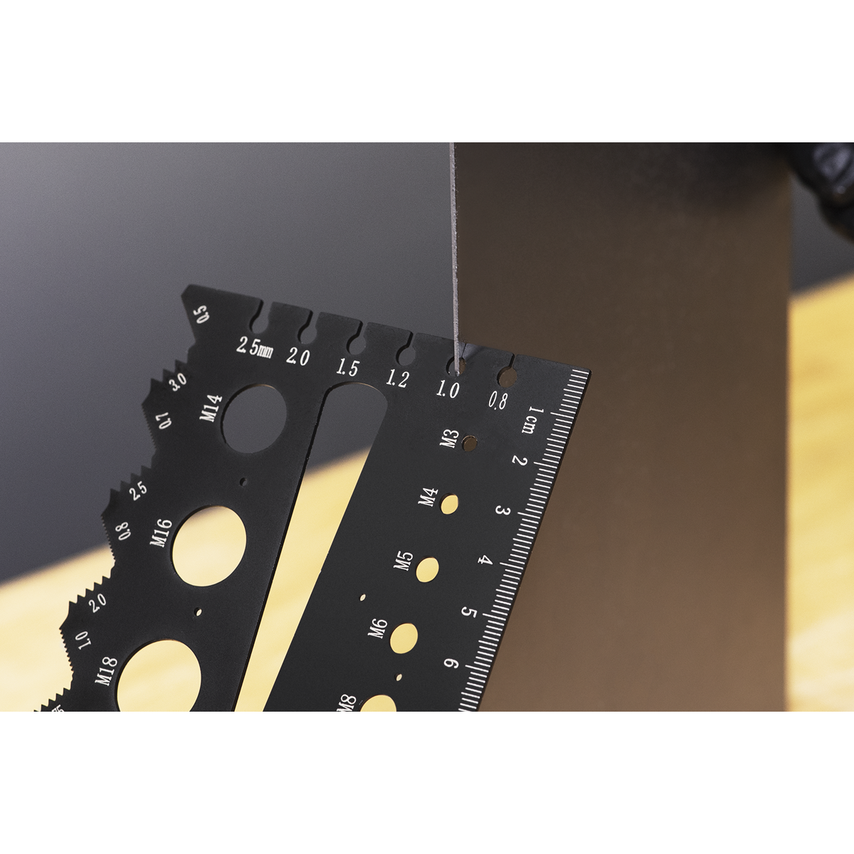 Stainless steel multifunction thread/pitch identification gauge. Easily identify the size of bolt, drill bit or tap that is required. Checks the thickness of washers and diameter of electric wire. Use as a set square, to measure angles 0-180° and as a ruler.