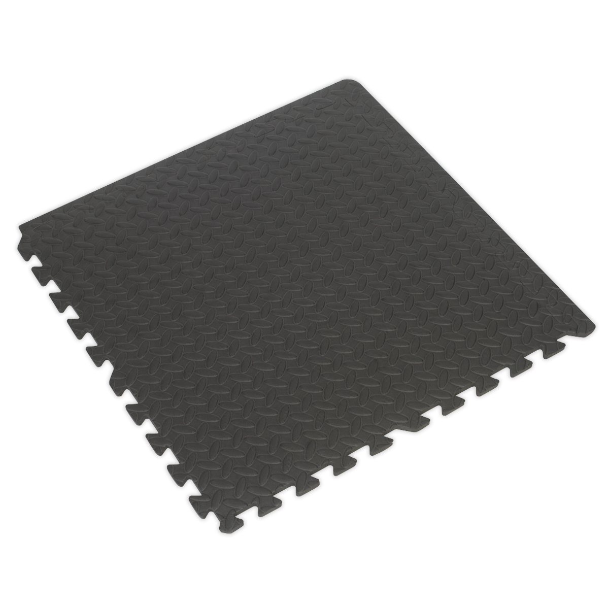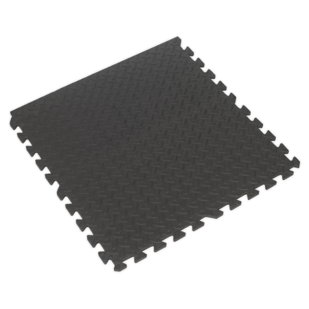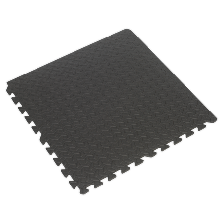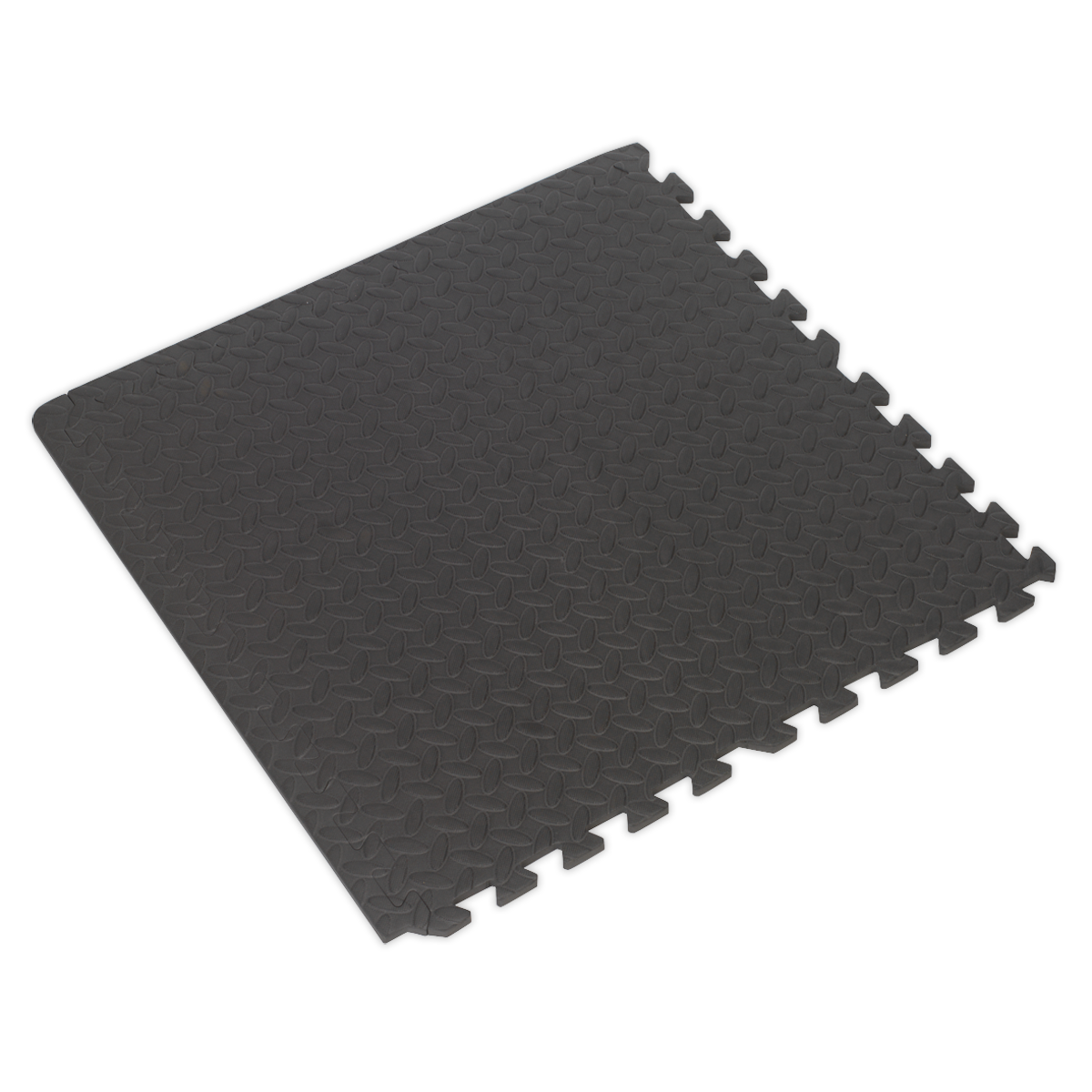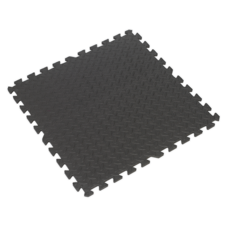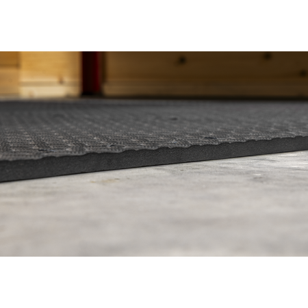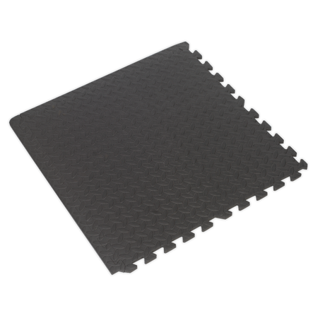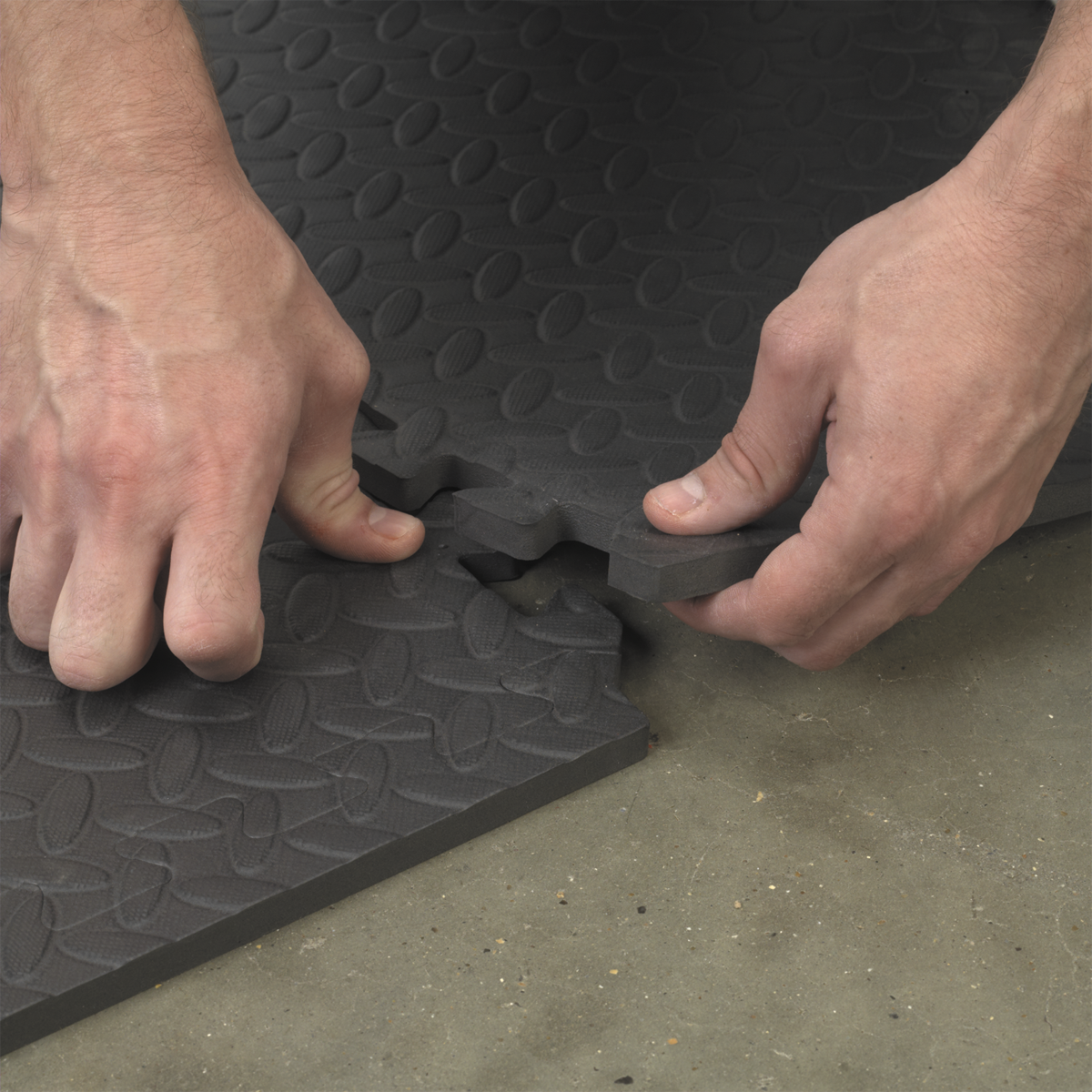 Hard-wearing anti-slip EVA foam matting suitable for use in the workshop and machine room. Provides fatigue relief and insulation from cold concrete floors. Interlocks to make any length in units of 600mm. End section edges to prevent damage.