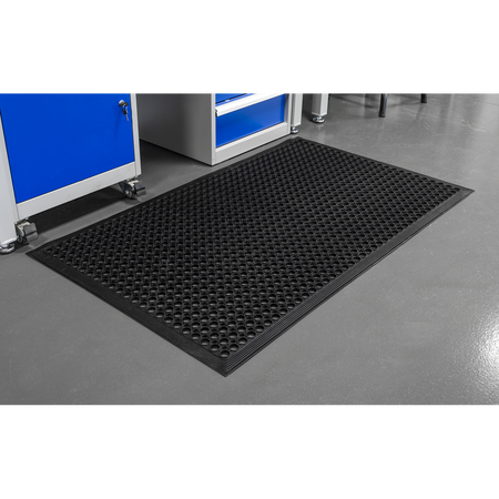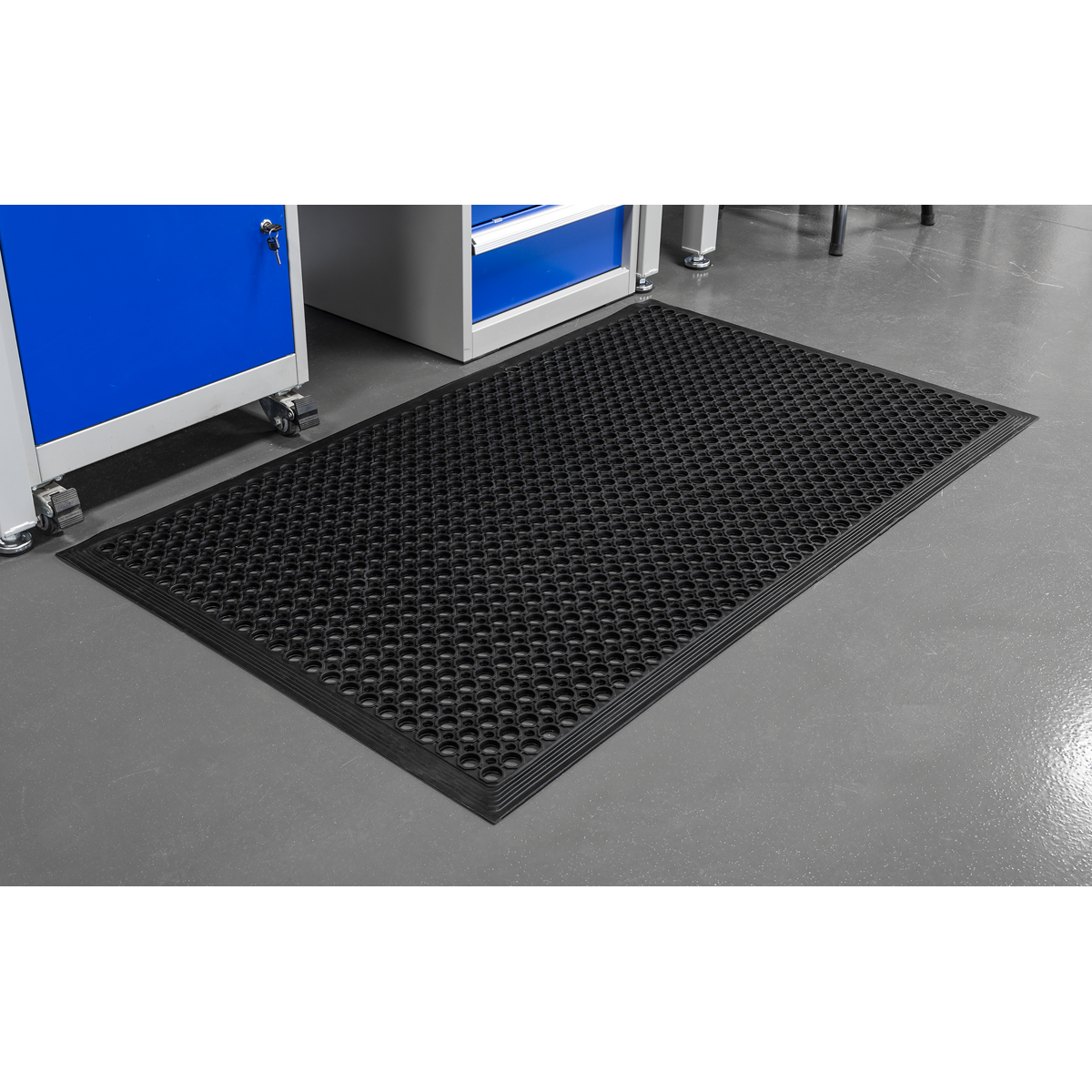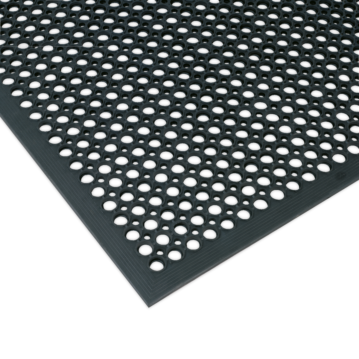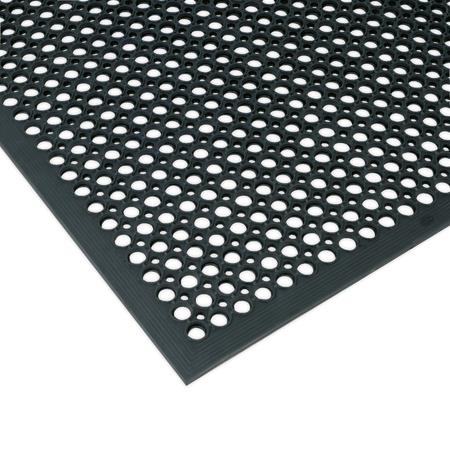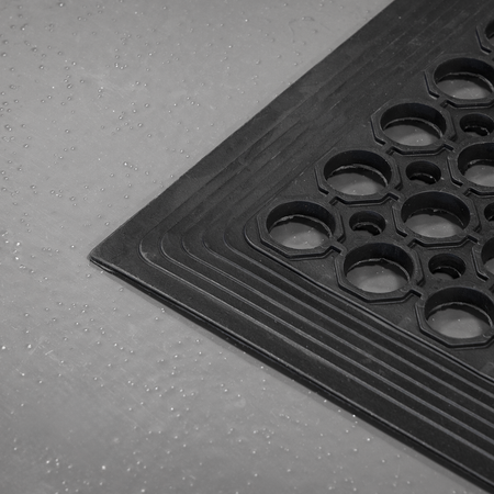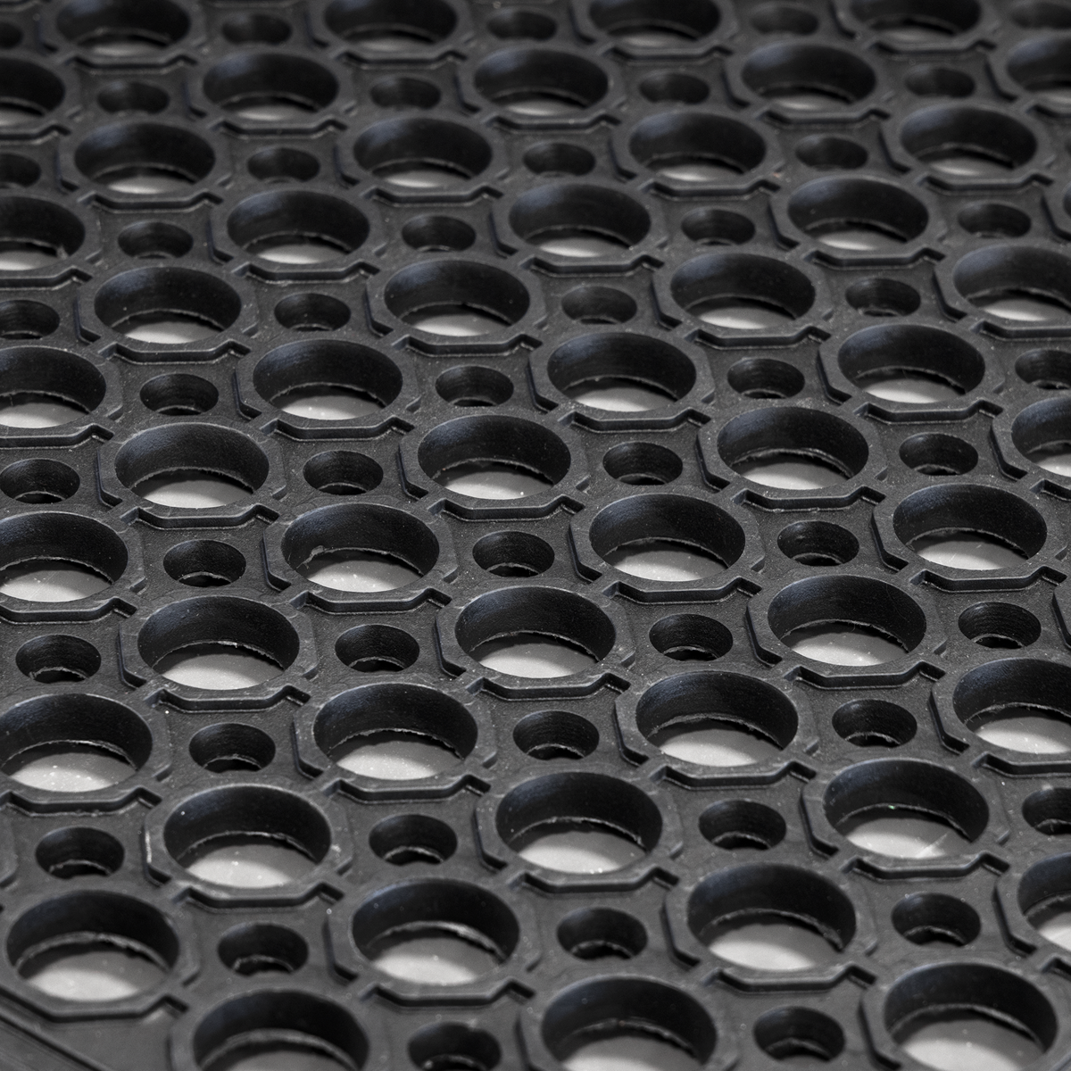 Hard-wearing rubber provides fatigue relief and insulation from cold concrete floors. Raised circular surface design for superior slip resistance. Moulded bevelled edge to reduce risk of tripping.
