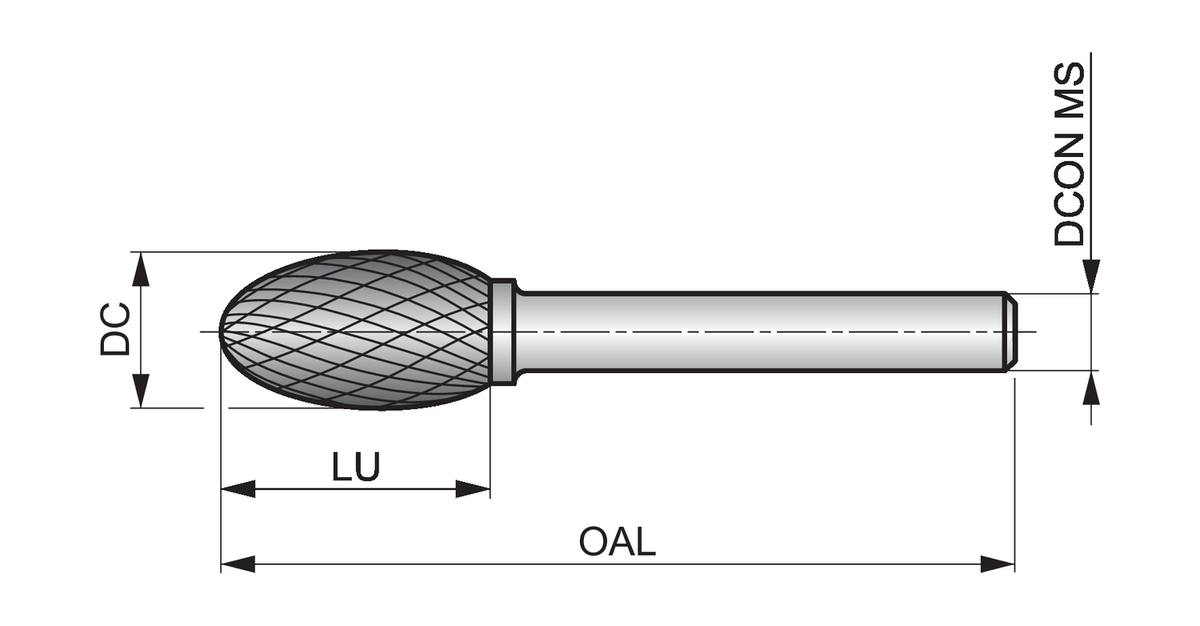 Oval burr (E shape), diameter 12.7mm with 22mm length of cut, 67mm overall length and 6mm shank, carbide tipped with toughened and hardened steel shank and bright finish, DC double cut flute style with close spaced edges for round edge contouring in steel and cast steel, stainless steel, cast-iron, copper or copper alloys, high-temperature alloys, hardened materials