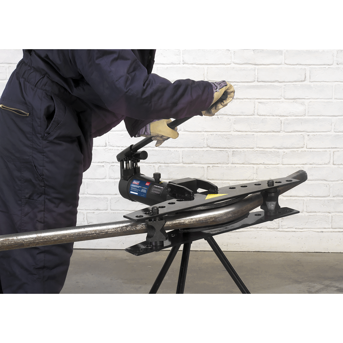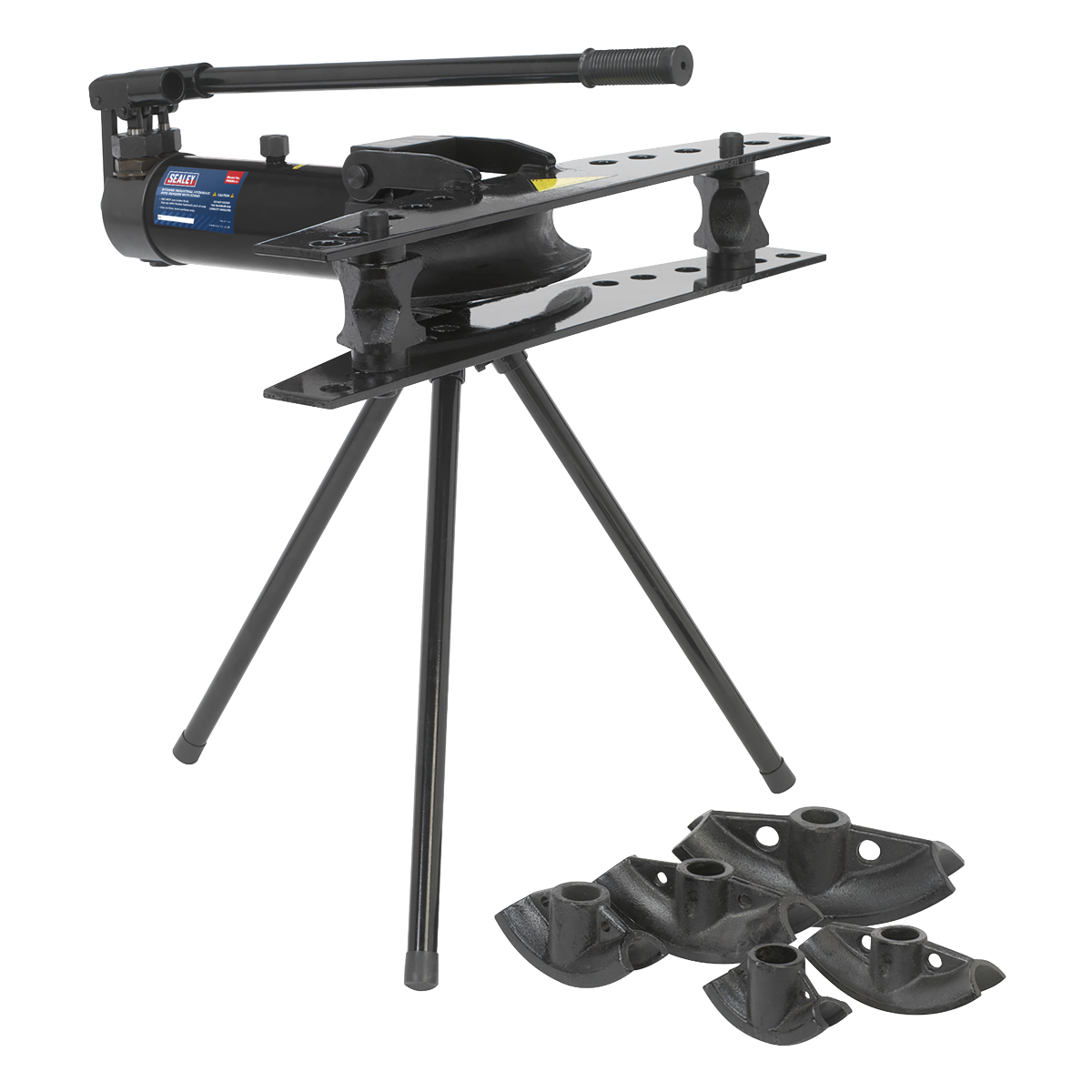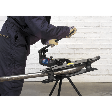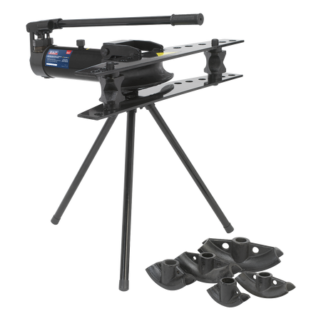 Tripod mounted pipe bender suitable for bending pipes up to 180°. Integral 9 Tonne ram. Suitable for bending DIN classified medium and heavy pipe. 2-Speed hydraulic pump gives fast pipe positioning and the power to bend 50mm pipe. Supplied with six (15mm(1/2") - 50mm(2")) interchangeable dies. Packed in a heavy wooden crate for easy transportation.