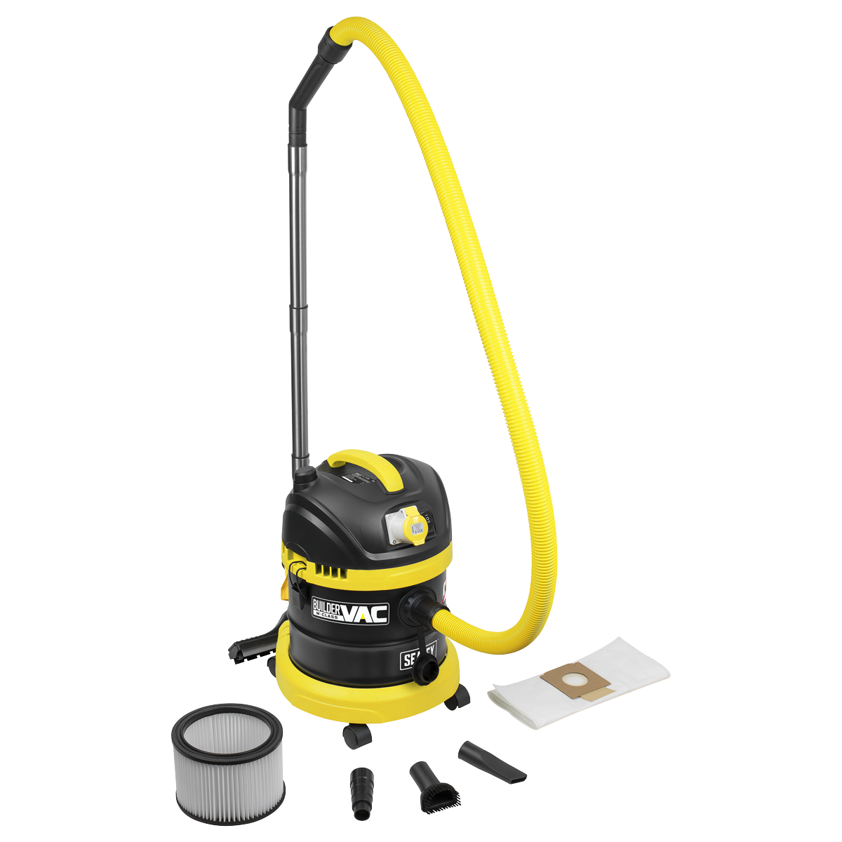 M Class filtration filters particles down to 1 micron, minimising exposure and safely contains potentially harmful dust particles. Fitted with a shut-off valve and sponge filter for vacuuming liquid or HEPA cartridge filter for dry vacuuming. Durable painted stainless steel drum is mounted on four swivel castors for easy manoeuvrability and positioning. Filter shake cleaning function reverses the airflow to effectively clean the filter and restores suction, which means the vacuum can also be used as a blower. Features power tool plug socket that automatically turns the vacuum on/off when a power tool is turned on/off. 110V Supply is suitable for use on job sites, workshops and garages. Fitted with 5m cable and 1.5m suction hose. Supplied with three aluminium extension tubes, cartridge filter, wet-use foam filter, dust collection bag, power tool adapter, floor brush, crevice tool and round brush.