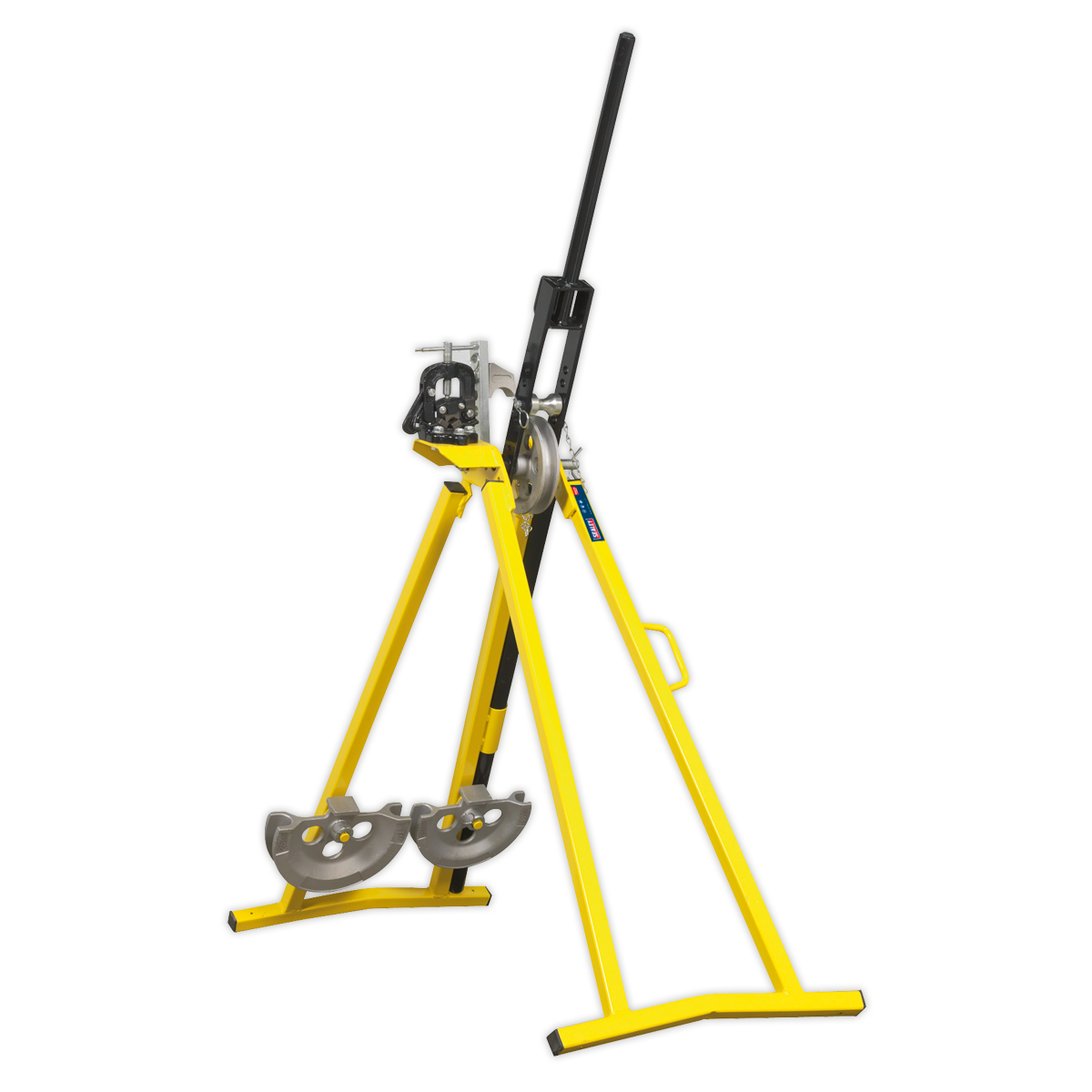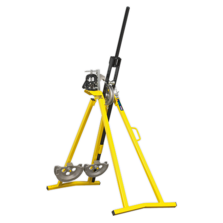 Professional folding A-frame conduit bender with vice. Suitable for galvanized and black enamel conduit. Supplied with two machine cast formers - Ø20 and Ø25mm, which will bend conduit up to a maximum length of 1100mm. The vice aids cutting lengths and threading. Additional former for Ø32mm conduit available separately, order Model No. PCB32.03.