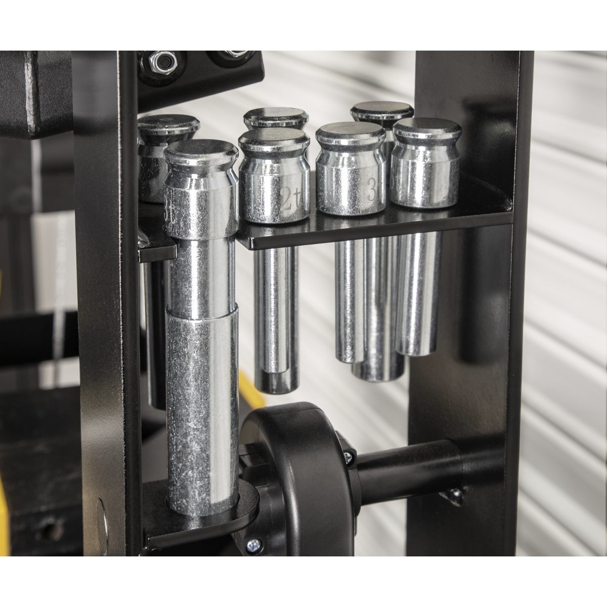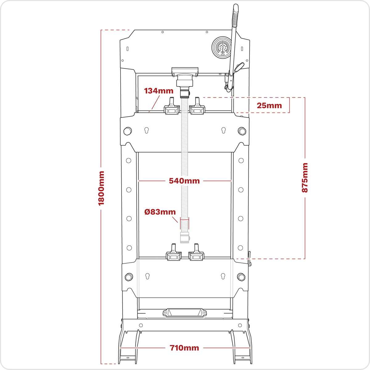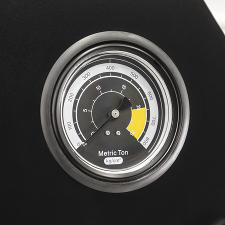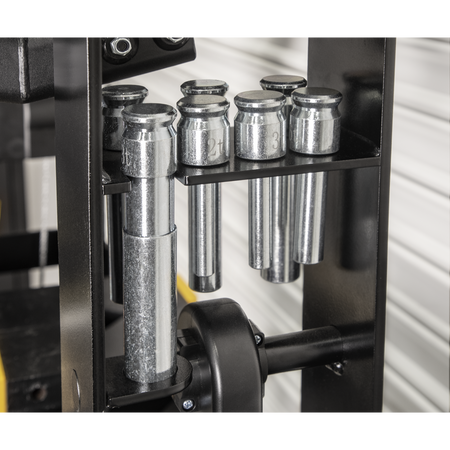 Heavy-duty steel frame construction with handle operated hydraulic pump unit. Screw adjustable ram and adjustable work area with removable tray. Winch assisted press table adjustment. Frame head fitted with ram pressure gauge. Storage for press pins included in frame. Supplied with press pins, flat pressing plate/V-blocks.