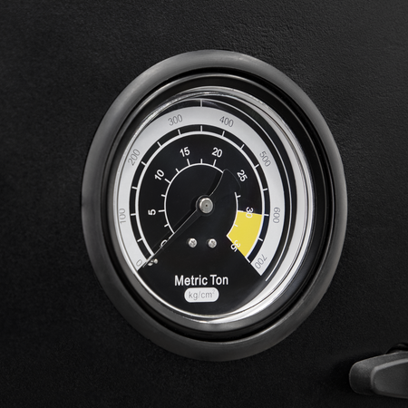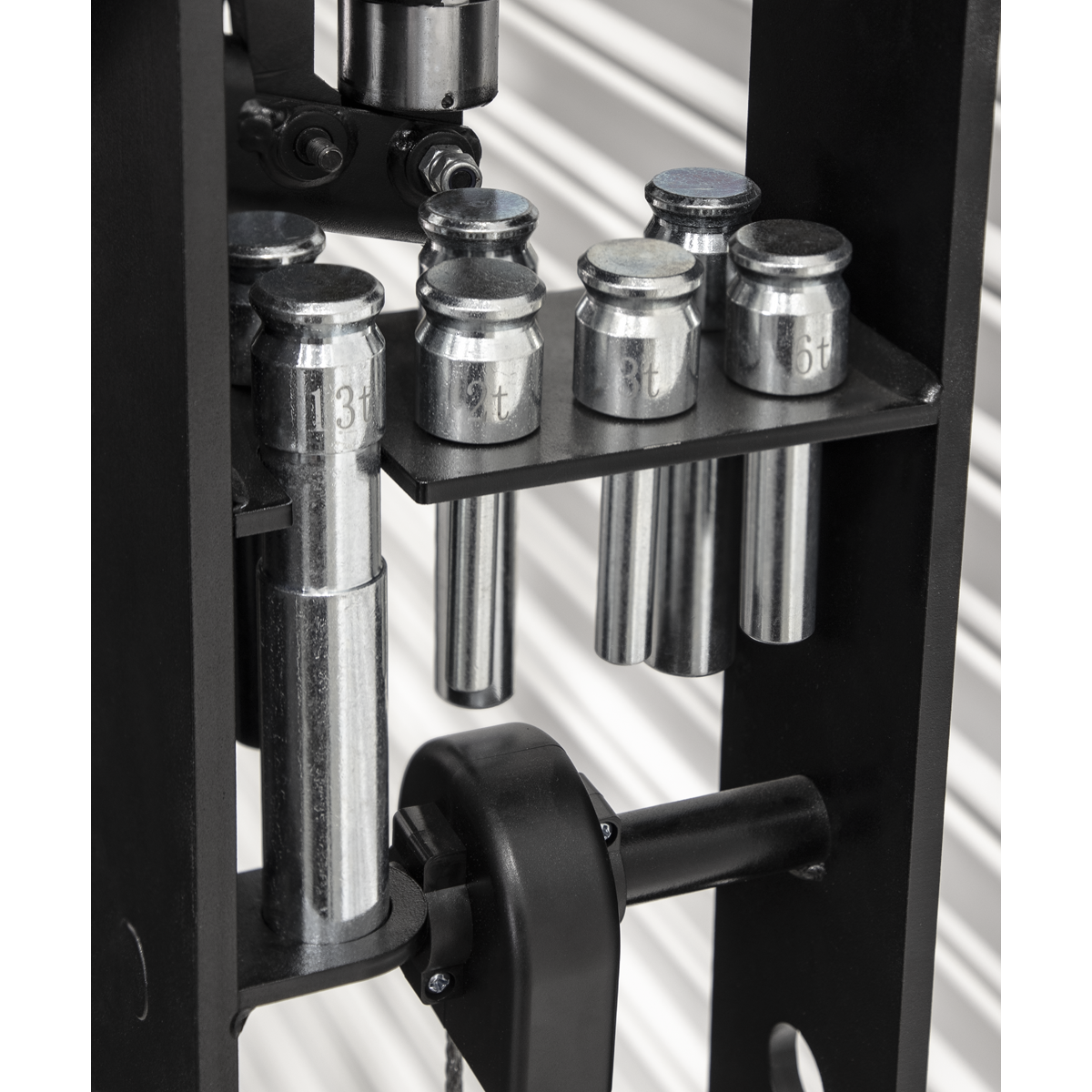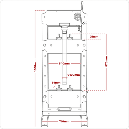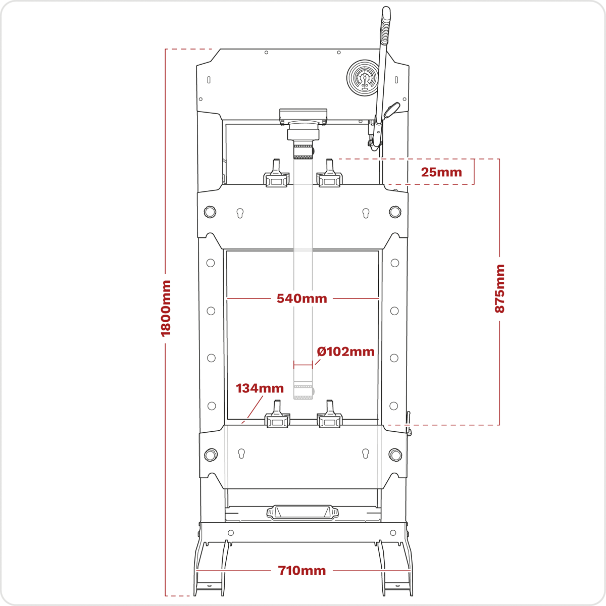 Heavy-duty steel frame construction with handle operated hydraulic pump unit. Screw adjustable ram and adjustable work area with removable tray. Frame head fitted with ram pressure gauge. Winch assisted press table adjustment. Storage for press pins included in frame. Supplied with press pins, flat pressing plate/V-blocks.