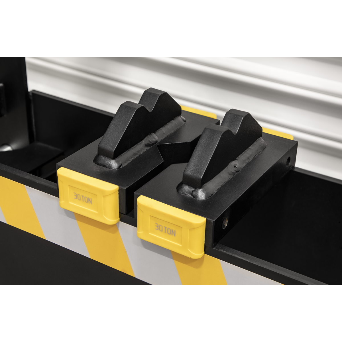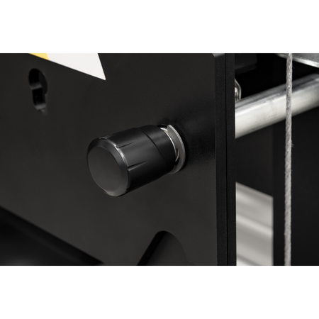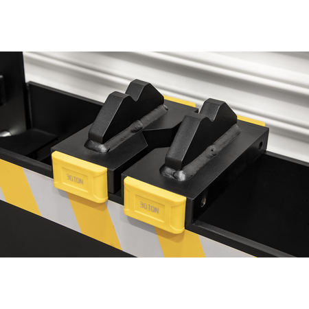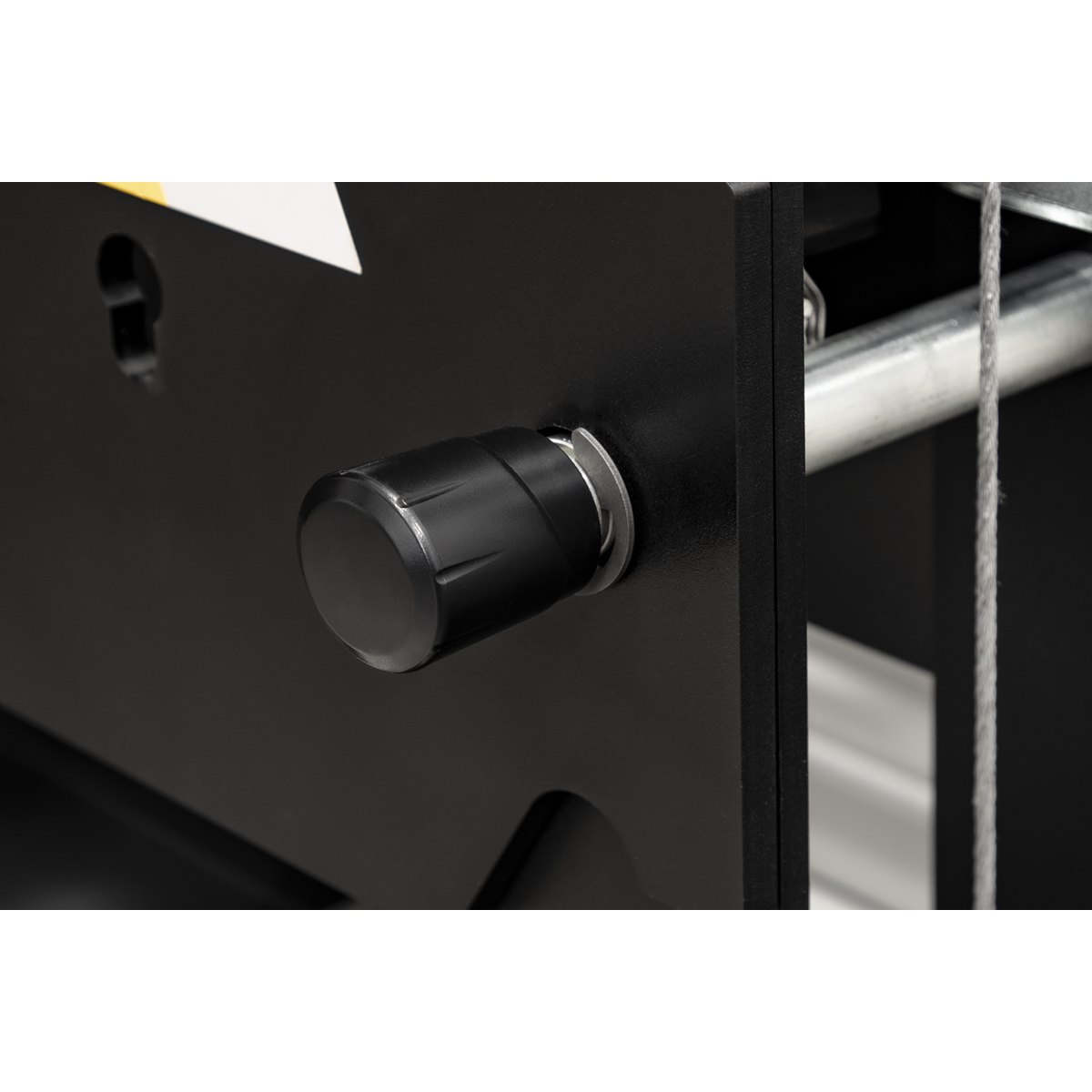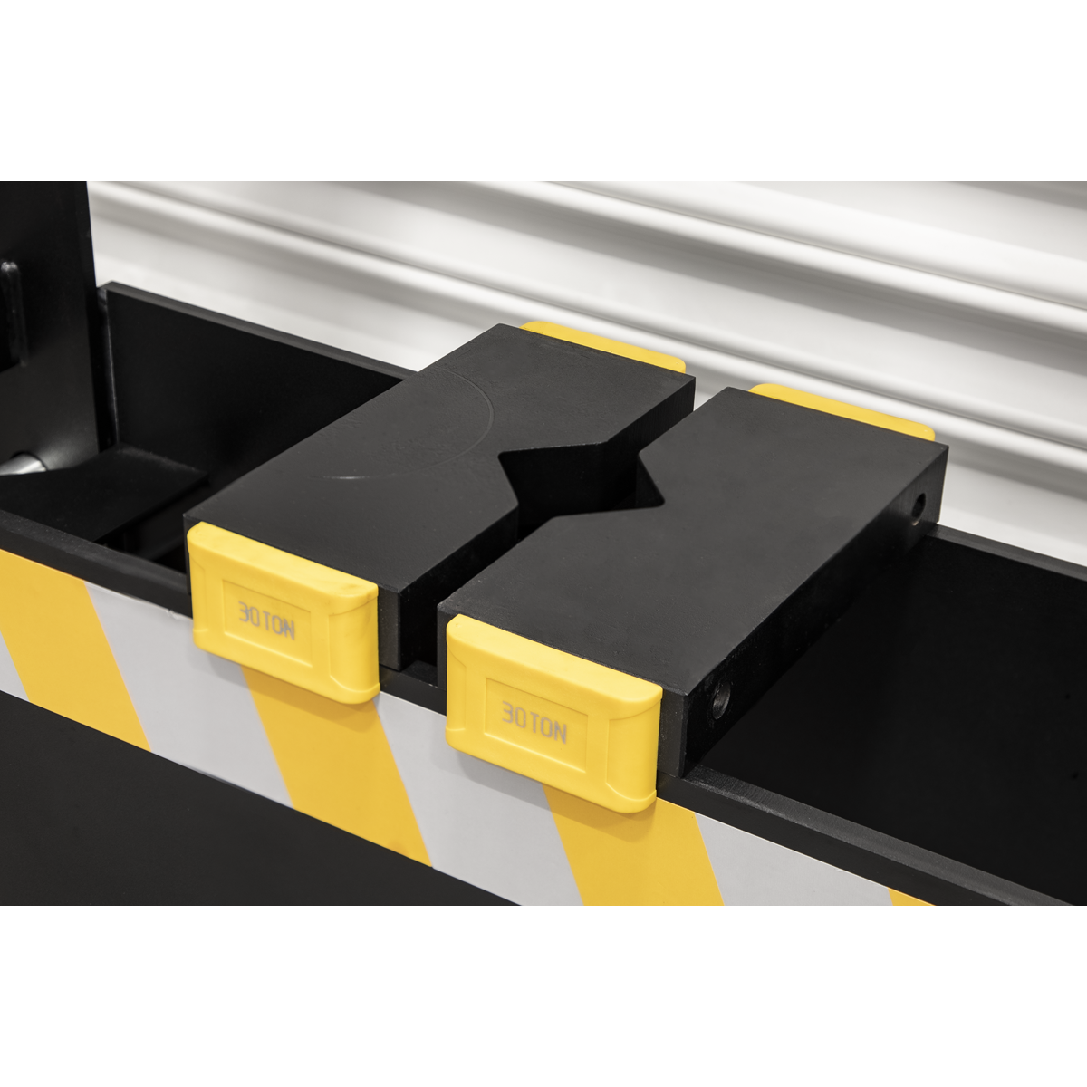 Heavy-duty steel frame construction with handle operated hydraulic pump unit. Screw adjustable ram and adjustable work area with removable tray. Frame head fitted with ram pressure gauge. Winch assisted press table adjustment. Storage for press pins included in frame. Supplied with press pins, flat pressing plate/V-blocks.
