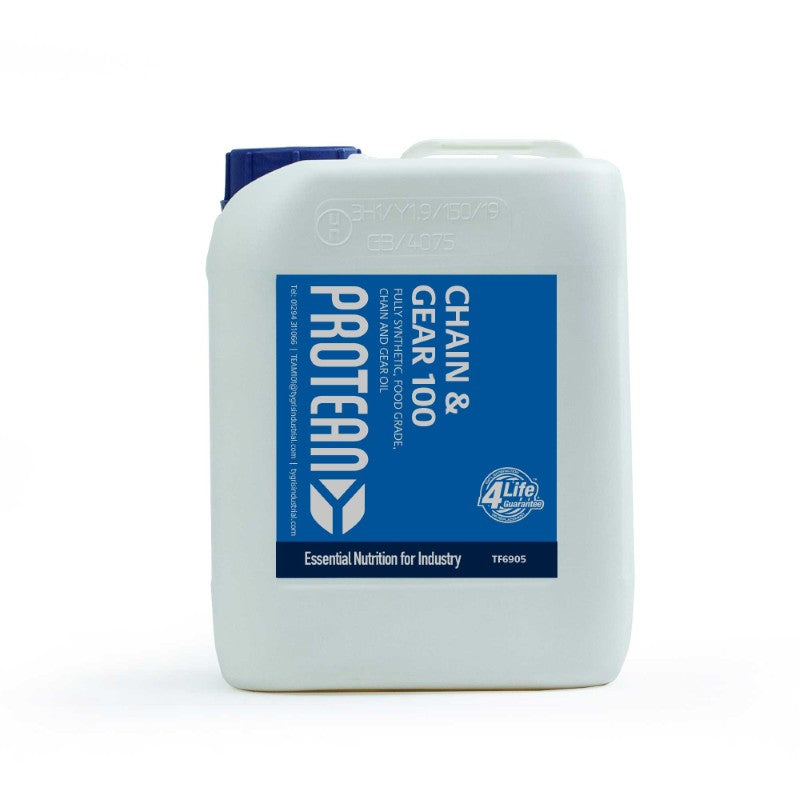 PROTEAN Chain & Gear 100 is a NSF H1 registered, fully synthetic oil designed for the effective lubrication of all types of conveyor and drive chains within Food & Beverage, Packaging, Pharmaceutical and other cleanroom environments. Suitable for gearboxes and reduction units, PROTEAN Chain & Gear 100 contains additives to extend servicing and lubrication intervals, boost performance, improved adhesion and offers excellent water wash-off resistance. Halal/Kosher Certified.