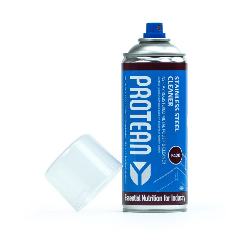 PROTEAN Stainless Steel Cleaner is an NSF: A7 registered dual action cleaner and polish suitable for use within Food & Beverage, Packaging, Pharmaceutical and other cleanroom environments. Available in a convenient spray formulation, PROTEAN Stainless Steel Cleaner has been designed for use on stainless steel, aluminium and chrome and provides a protective coating to aid future cleaning and prevent corrosion.