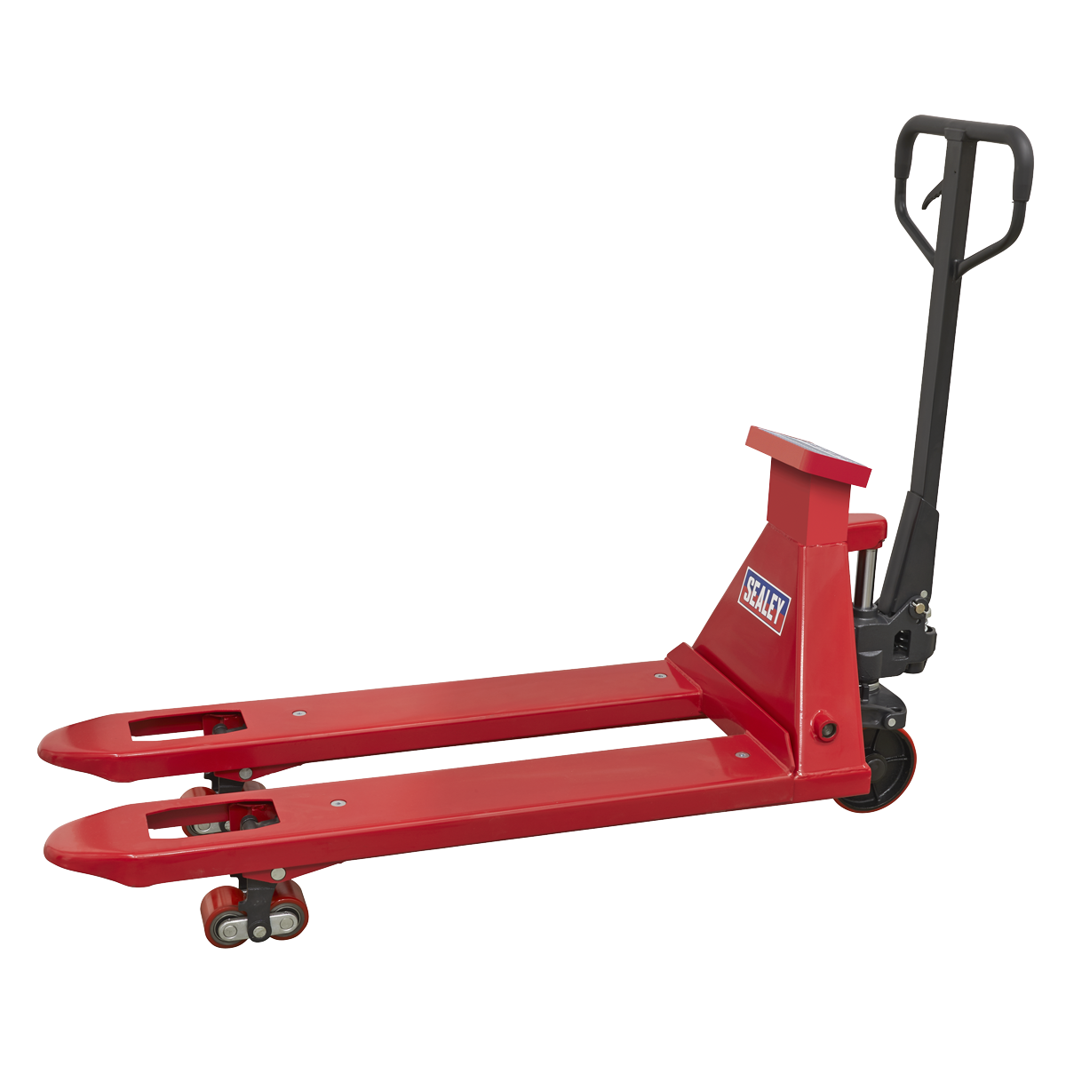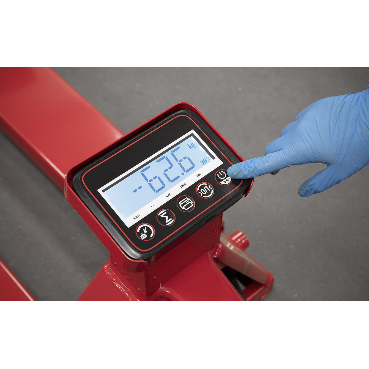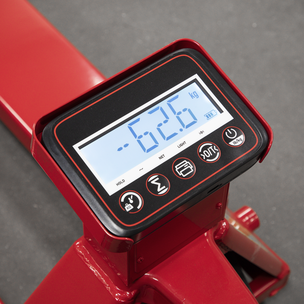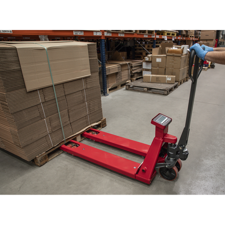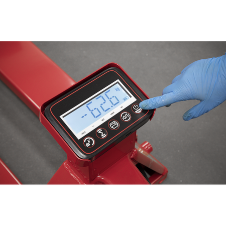 Heavy-duty pallet truck suitable for warehouse and general handling duties. Features built-in weighing scales with an accuracy of +/-1kg. 6-Digit, high contrast LCD display. Control panel has a tare function to allow for packaging weight. Scales powered by a built-in 6V/4.5A rechargeable battery. Supplied with charging level indicator pin charger. This item is heavy. Extra assistance must be provided at the delivery point to help its safe delivery.