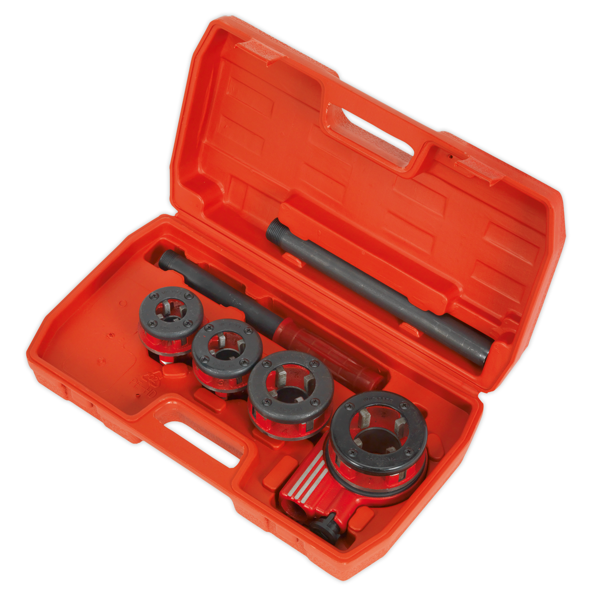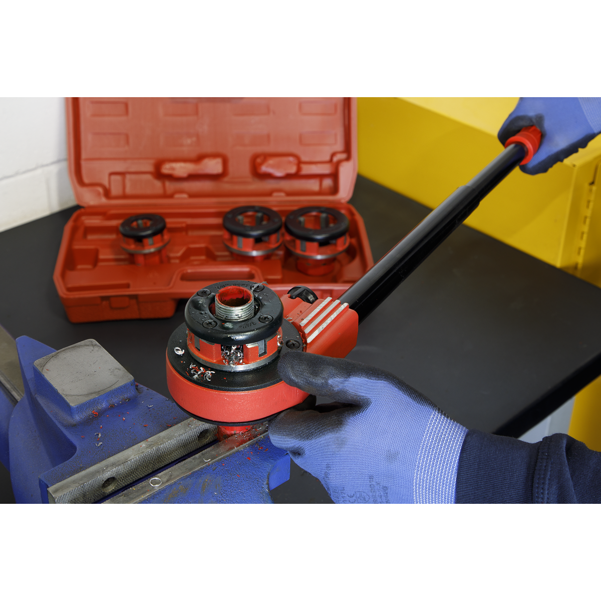 Ratchet type pipe threading kit with cassette style die heads. Lightweight design with four tool steel cutting bits. Snap-in die cassettes allow fast interchange between pipe sizes. Suitable for iron and stainless steel pipe. Twin ratchet pawl head assembly with free run facility. Supplied in storage case.