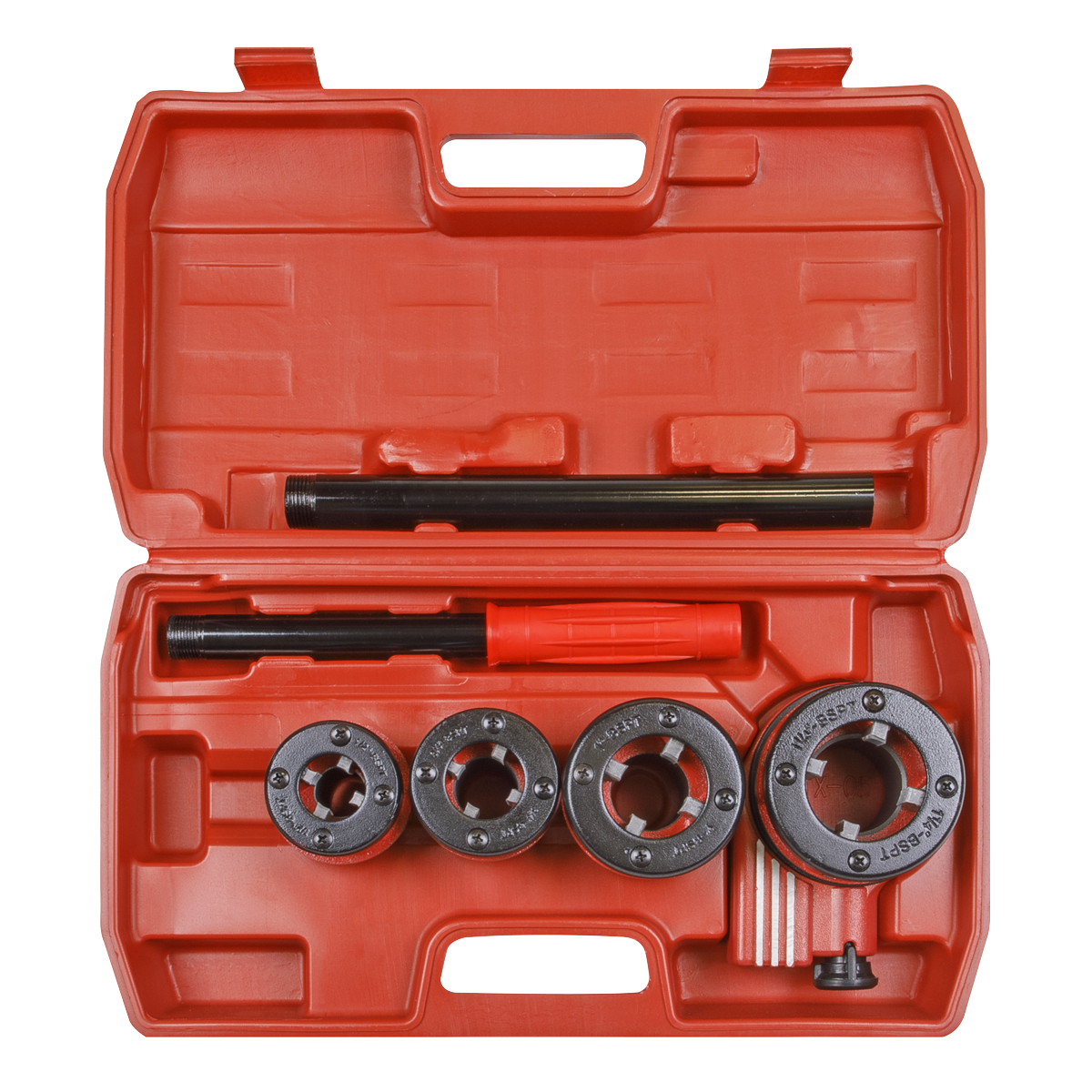 • Contents: Ratchet Die Stock, Dies; 1/2", 3/4", 1", 1-1/4", 2-Piece Handle.