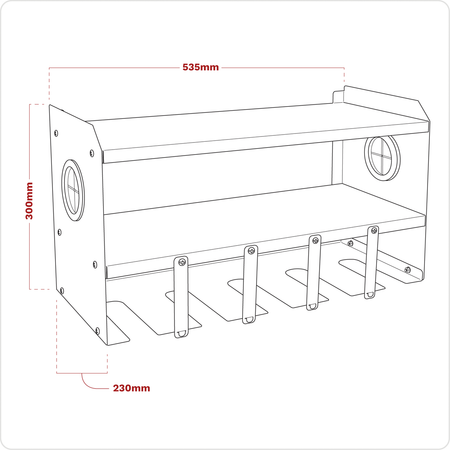 Wall mounting rack specifically designed for power tool storage. Shelf space for power tool battery and chargers. Open fronted bays make tools easily accessible. Supplied flat-packed.