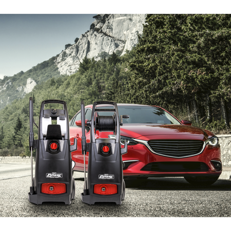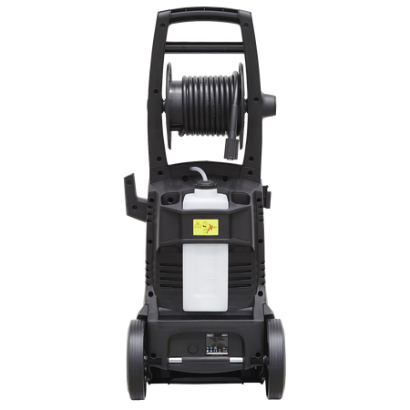 Professional, heavy-duty unit designed for extensive domestic and light commercial use. Ideal for a range of applications including cleaning vehicles, commercial equipment, motorbikes, patios and decking. Fitted with a powerful 2500W motor with a 438L/hr water flow rate and a maximum pressure of 170bar. Automatic Total Stop System (TSS) which switches the motor on and off when the lance trigger is operated using less water and electricity and therefore prolonging the motor life. Fitted with 5m hose reel, accessory storage on back of unit and side mounted gun and lance holder to ensure the unit stays clutter-free and fully mobile. Self-priming inlet allows the suction of water from an external source. This is ideal in low pressure environments and gives the user greater flexibility when cleaning. Features high quality polished chrome and brass fittings. Supplied with 5m hose, variable nozzle and Rotablast nozzle which helps develop the same Effective Cleaning Power (ECP) as a 275bar/3995psi pressure washer. Manufactured with heavy-duty plastic wheels for transportation over rough terrain. Supplied with power cable fitted with 3-pin plug.
