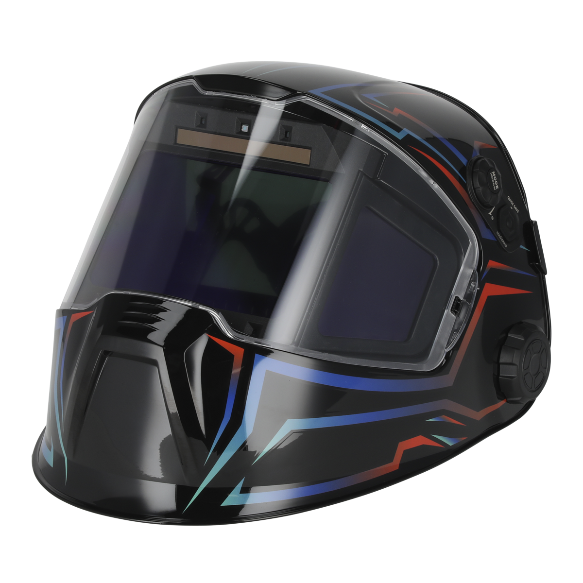 Fully digital panoramic welding helmet with true colour technology gives the best possible welding experience, providing improved depth perception and better peripheral vision. High quality variable shade 9-13 lens manufactured and tested to ISO 16321. Fully automatic switching from light to dark on striking arc. Digital control panel easily switches between modes and set delay, sensitivity and shade settings. Also includes memory-save function to preset and save up to nine personalised settings. Externally, the helmet also features rotating switch and mode selector to easily switch between welding and grinding settings whilst adjusting shade without removing the mask. Battery is easily replaceable but has solar back up to prolong the battery life. Suitable for MIG, TIG, arc/MMA, gas welding, cutting and grinding.,• PANORAMIC WELDING HELMET - Fully digital panoramic welding helmet and true colour technology give the best possible welding experience providing improved depth perception and better peripheral vision.