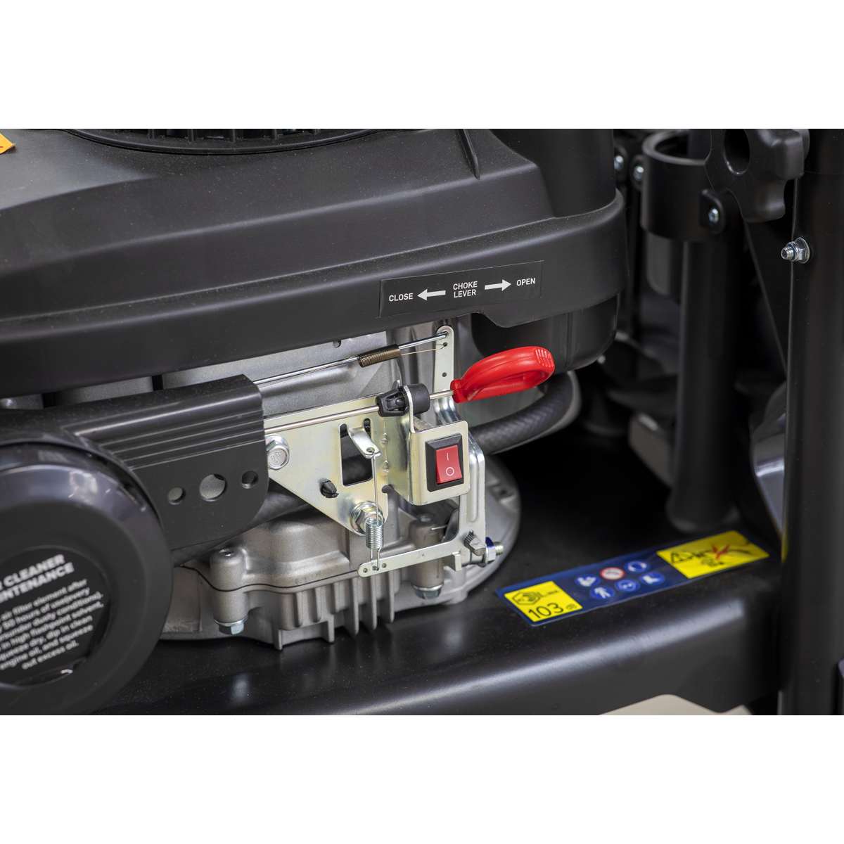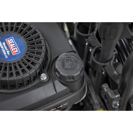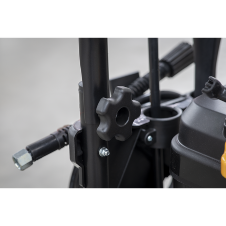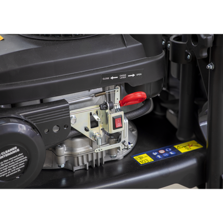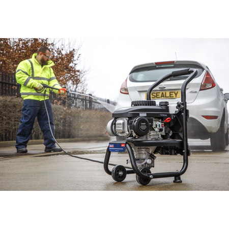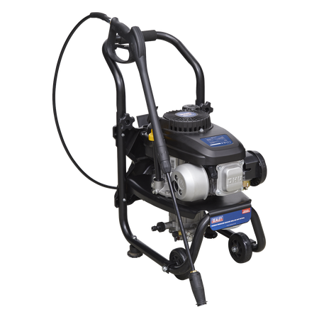 Petrol powered pressure washer with recoil starting. Suitable for commercial and domestic applications with 5m pressure hose, gun, lance and adjustable nozzle. Low-pressure liquid detergent injection system. Safety latch on trigger. Unit stands on two sucker feet to prevent movement and two wheels for easier mobility with an integral handle.