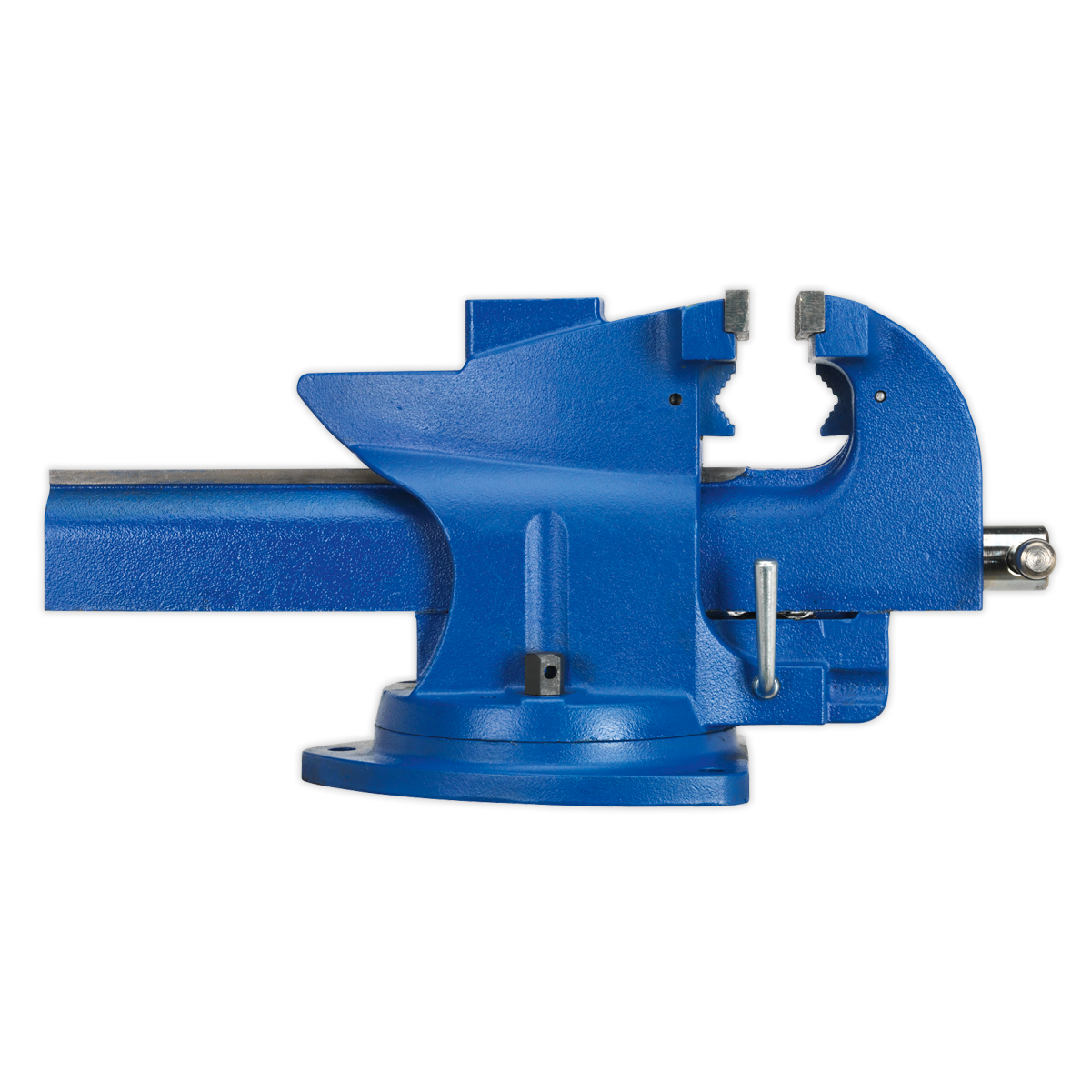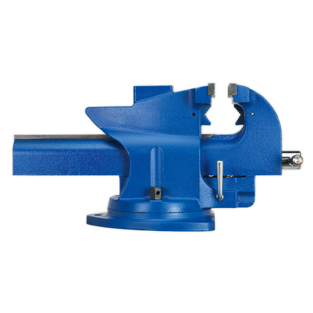 Time-saving bench mounting swivel base vice with cast iron body. Features a side lever for engaging/disengaging main clamp, enabling quick-slide action to and from workpiece. Includes both, replaceable serrated steel jaws and pipe clamping jaws, with a heavy-duty anvil at the back.