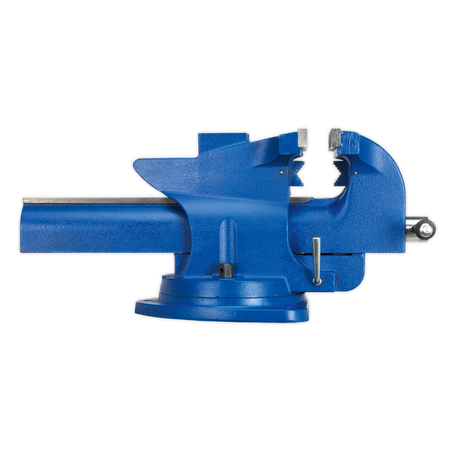 Time-saving bench mounting swivel base vice with cast iron body. Features a side lever for engaging/disengaging main clamp, enabling quick-slide action to and from workpiece. Includes both, replaceable serrated steel jaws and pipe clamping jaws, with a heavy-duty anvil at the back.