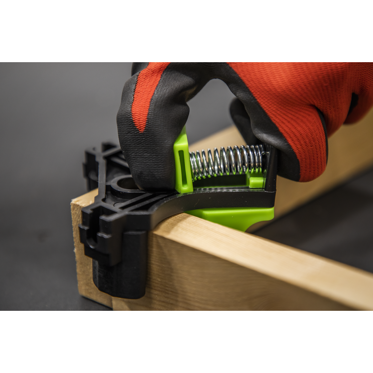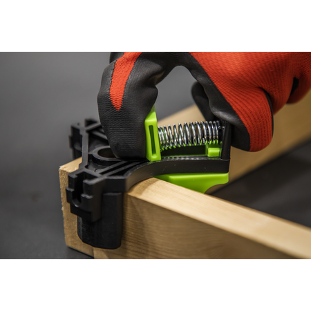 Fast and simple for fixing frames at a 90° angle. Ideal for wood thickness of 5-22mm. Aid for screwing or gluing joints together. Single hand operation. Ideal for making picture frames, small cupboards and assembling shelves.
