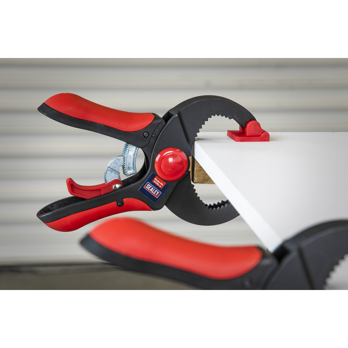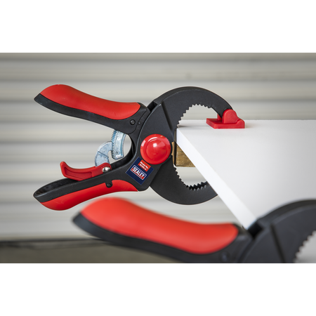 Quick ratcheting clamp with easy release trigger. Manufactured with a nylon body, TPR handle and textured pads. Free-moving pads enable clamping at multiple angles. Features maximum jaw opening of 45mm.