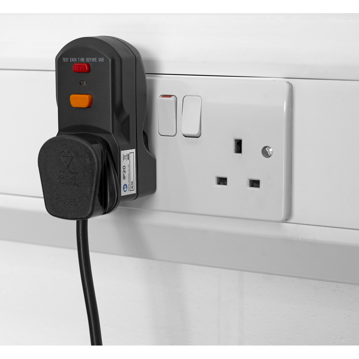 Cuts power automatically if an imbalance is detected between live and neutral (caused by leakage to earth). In the event of general power failure the RCD will not automatically reset meaning anything plugged into it will not automatically restart. No wiring required – plugs straight into 13A socket. No need to remove from socket to reset unit.