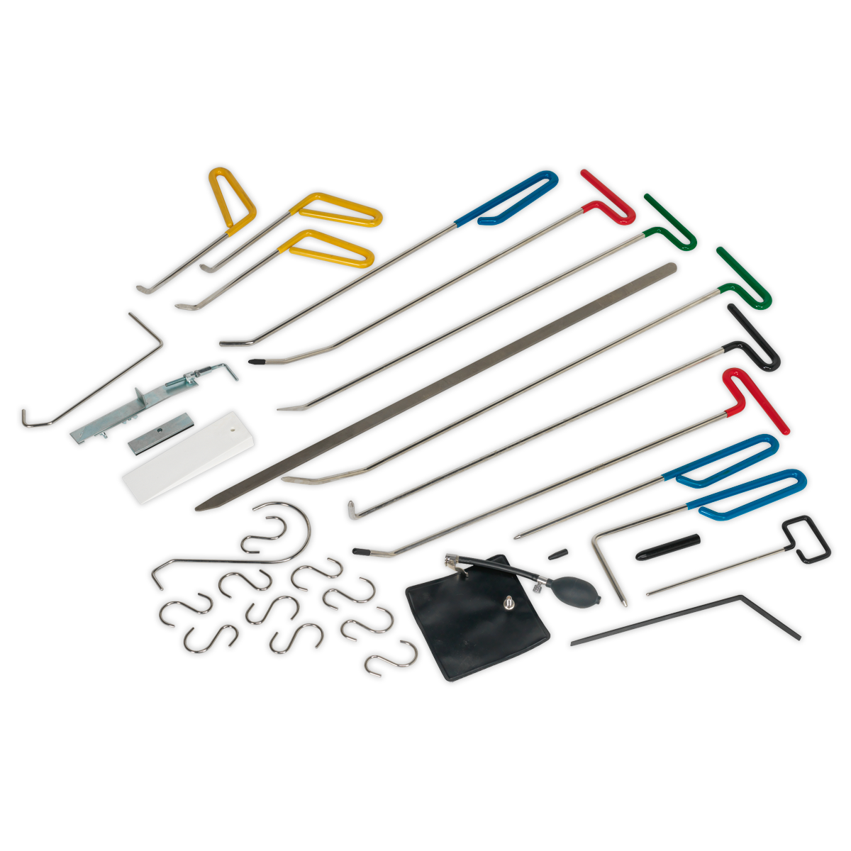 A comprehensive set of starter tools for the professional bodyshop technician. Heavyweight, heat treated, high quality steel components are carefully shaped and finished to allow the technician (with practice) to coax out all manner of dents and creases from behind the body panel, without the need to respray/refinish the painted surface. Time-saving kit of tools supplied in storage bag.,• A comprehensive set of starter tools for the professional bodyshop technician.