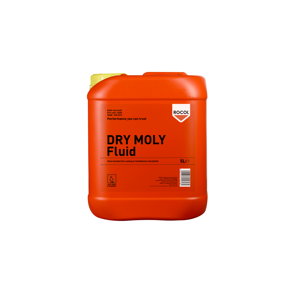 ROCOL® Dry Moly Fluid provides a very high content molybdenum disulphide film. It is designed to lubricate sliding mechanisms such as plain bearings, pins, cams and slides where a wet lubricant cannot be tolerated. Molybdenum disulphide (MoS2) is a great lubricator and very resistant to high loads. Also available in as an aerosol – see Dry Moly Spray. And in paste form – see Dry Moly Paste.