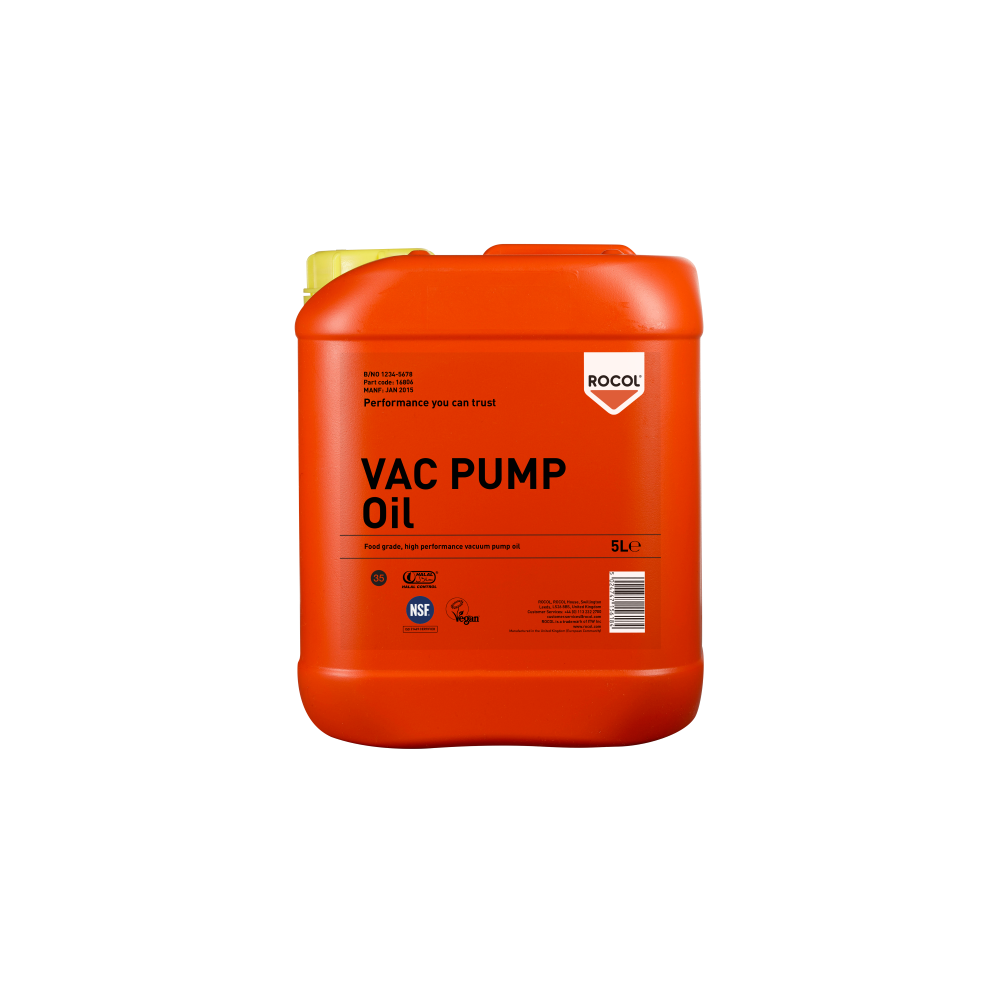 ROCOL VAC PUMP Oil has a low vapour pressure to enhance pump efficiency and is suitable for use with a wide range of vacuum pump formats particularly those found in food, pharmaceutical and other clean environments where NSF H1 lubricants are required.