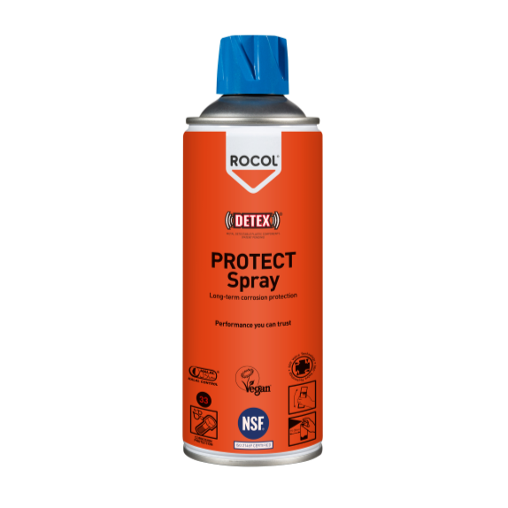 ROCOL® PROTECT Spray leaves a heavy duty waxy film for long term corrosion protection of all types of components and equipment particularly those operating in clean environments such as food & pharmaceutical and outdoor environments. PROTECT Spray is chemically resistant and ideal for exposed metal components and machinery in storage, both indoors and outdoors. PROTECT Spray is highly resistant to water wash-off and provides excellent corrosion protection for a wide variety of applications commonly found in the food, pharmaceutical and manufacturing industry.