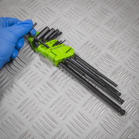 Manufactured from heat treated and hardened Chrome Vanadium steel with a blackened finish. Keys range in length from 90mm to 230mm and in size from 1/16" to 3/8". Ball-end allows key to drive fixing at up to 30°. Supplied in easy-access case with hanging tag for safe storage and quick key selection.