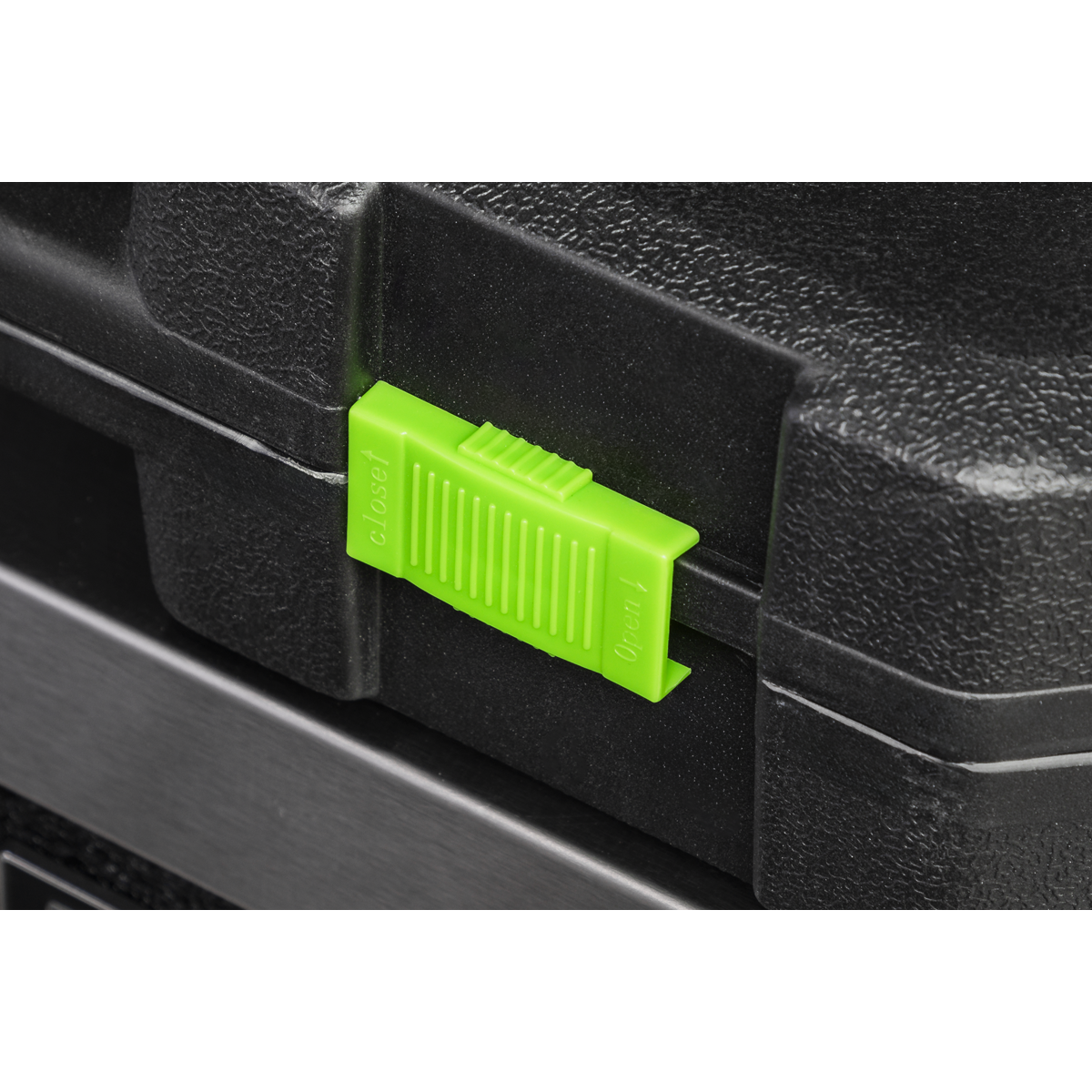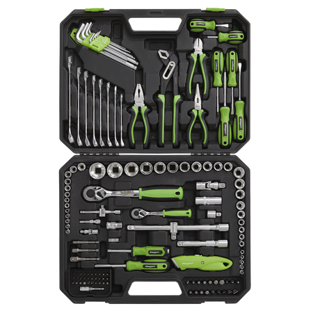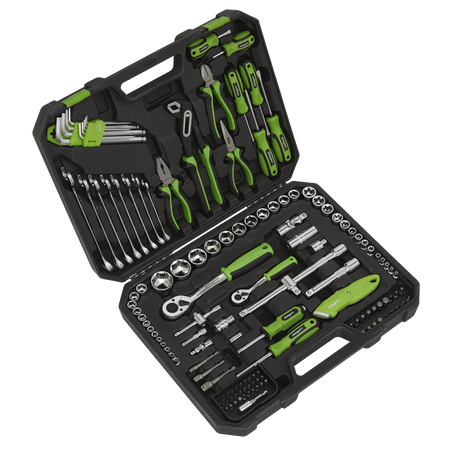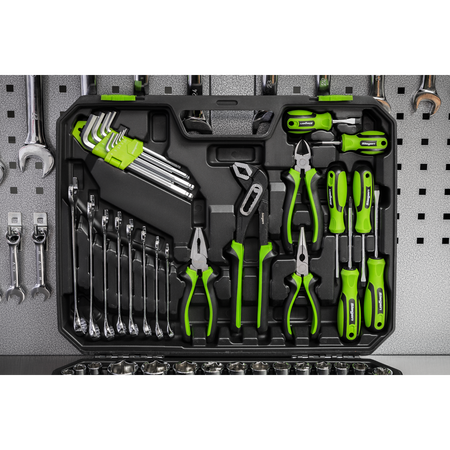 Comprehensive range of frequently used hand tools with 1/4" and 1/2"Sq Drive Reversible ratchet wrenches. Includes 1/4", 3/8" and 1/2"Sq drive sockets, hex keys, combination spanners, screwdrivers, pliers, utility knife, bit set and accessories. Tools feature soft grip handles for comfort and control. Supplied in a storage case.
