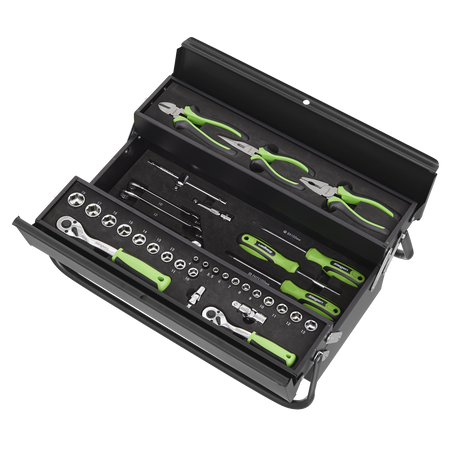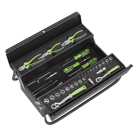 Comprehensive range of frequently used hand tools with 1/4" and 3/8"Sq drive reversible ratchet wrenches. Includes 1/4" and 3/8"Sq drive sockets, hex keys, combination spanners, screwdrivers, bit set and accessories. Tools feature soft grip handles for comfort and control. Supplied in a metal cantilever toolbox.